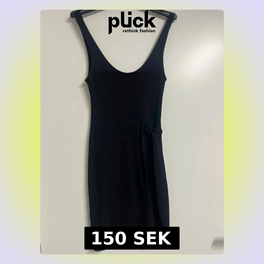 En enkel och stilren svart klänning med urringning och knytband i midjan. Klänningen är ärmlös och har en kroppsnära passform som framhäver figuren.