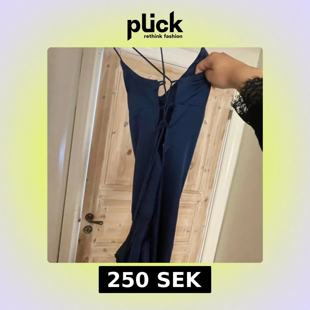 Säljer en marinblå långklänning med tunna axelband och snygg snörning i ryggen. Klänningen har en elegant v-ringning och är figurnära med ett mjukt, glansigt tyg som faller snyggt. Perfekt för dig som vill sticka ut med en stilren look. Skriv för fler bilder