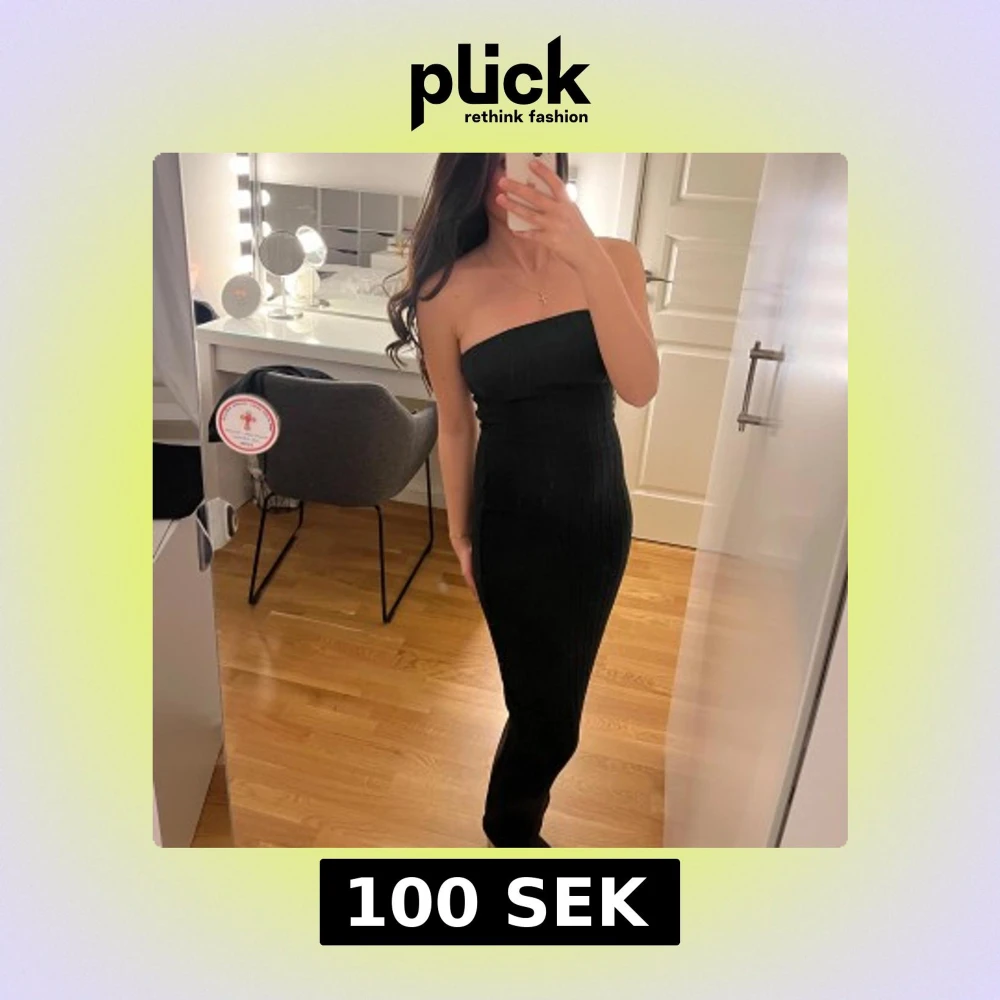 Elegant svart axelbandslös klänning med ribbad struktur. Perfekt för en stilren och sofistikerad look. Klänningen har en tight passform som framhäver figuren.