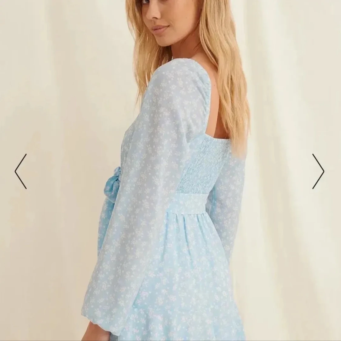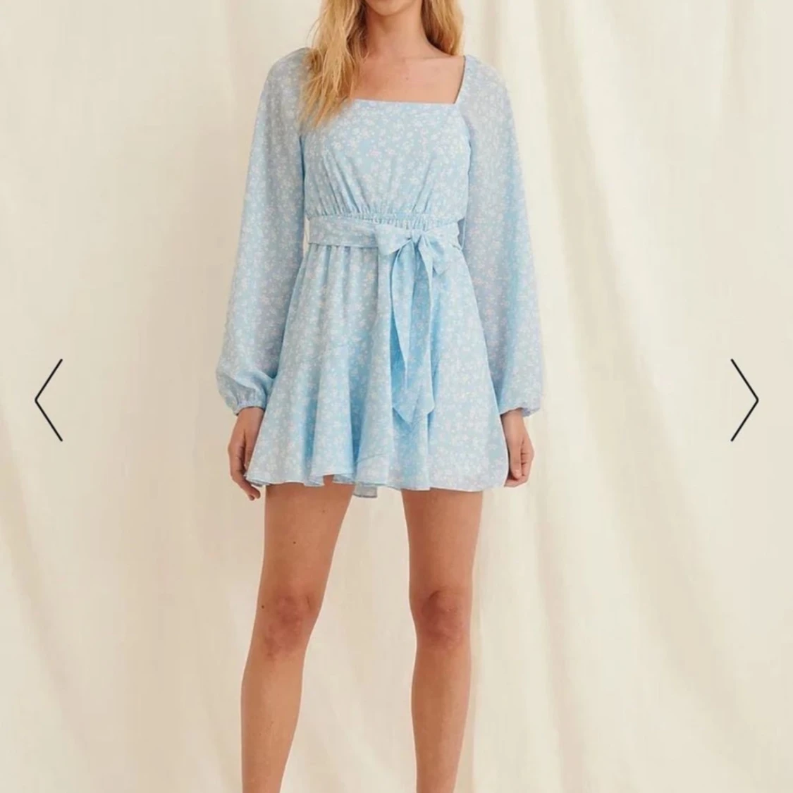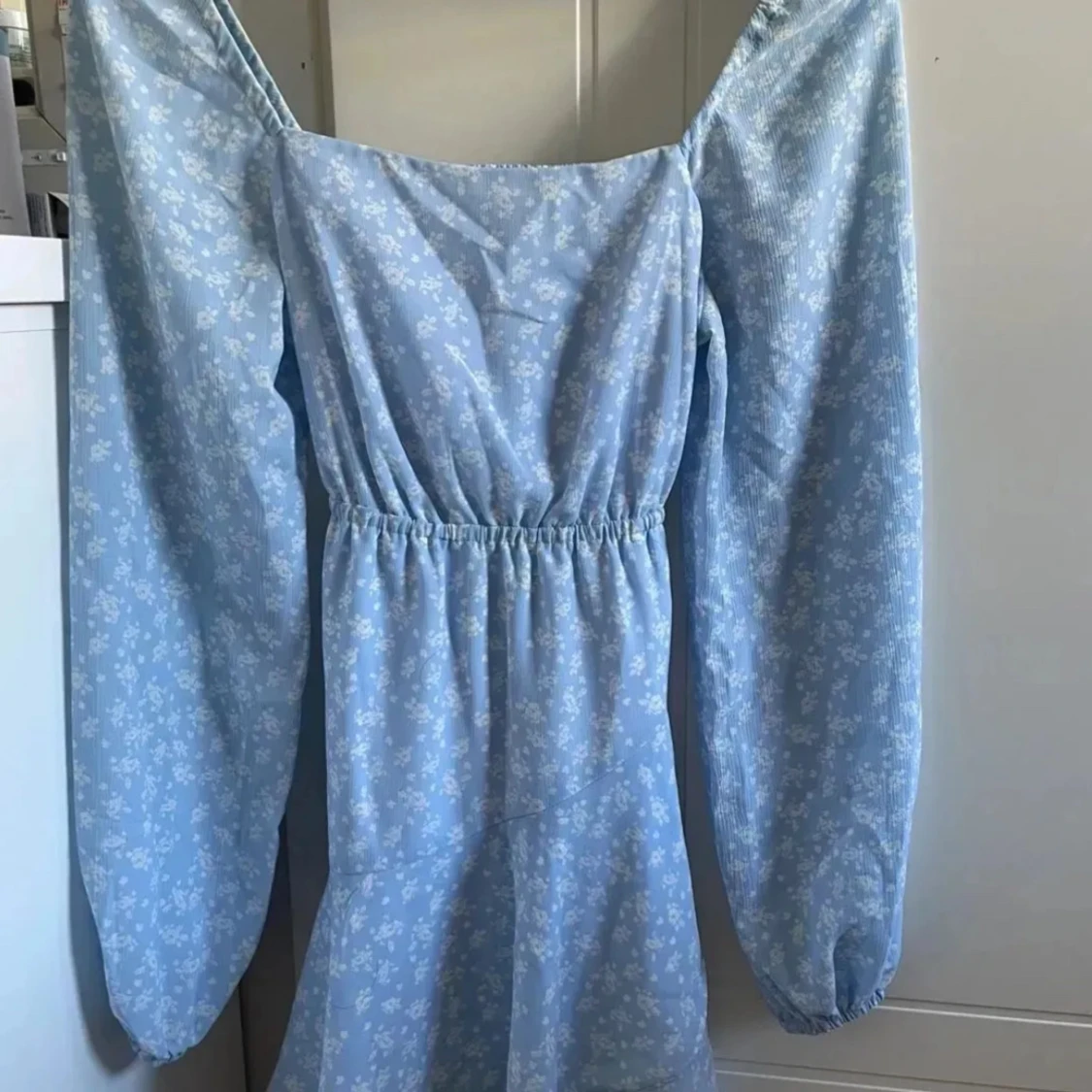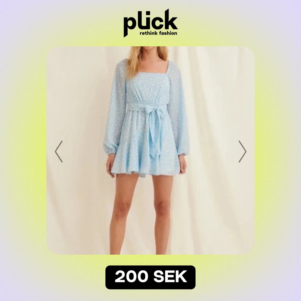 Säljer en superfin ljusblå klänning med blommigt mönster. Den har långa ärmar och ett knytband i midjan som ger en fin passform. Klänningen är perfekt för sommar och vår, och passar både till fest och vardag. Den är i nyskick och har en söt volangdetalj längst ner.