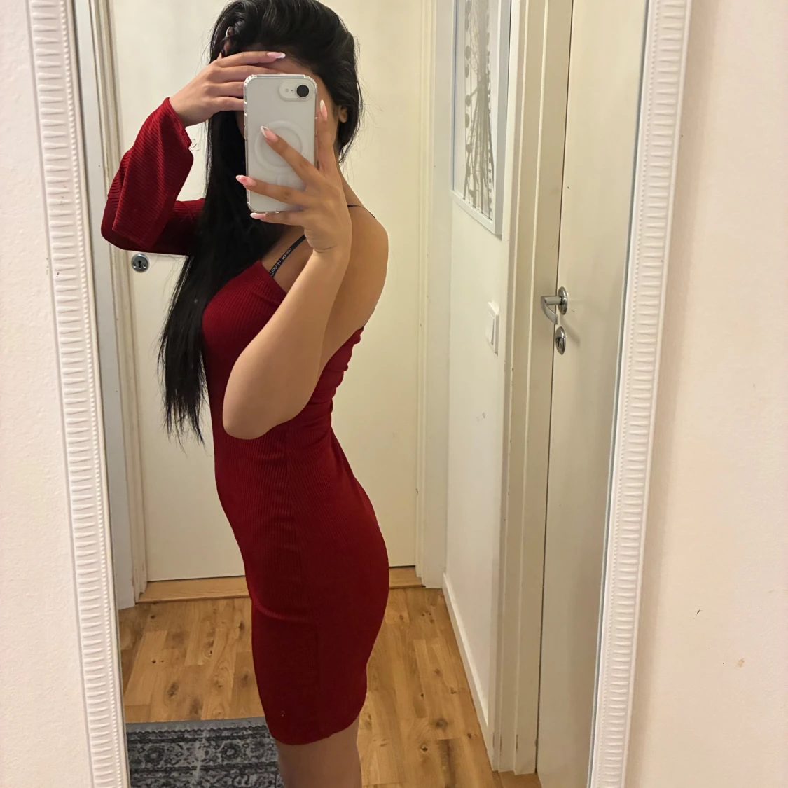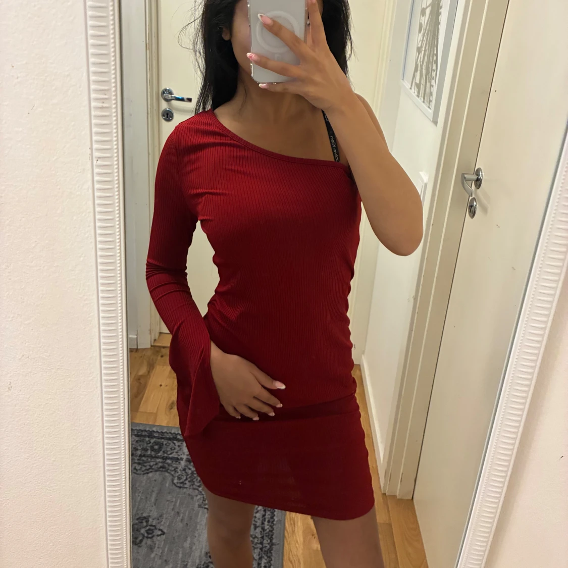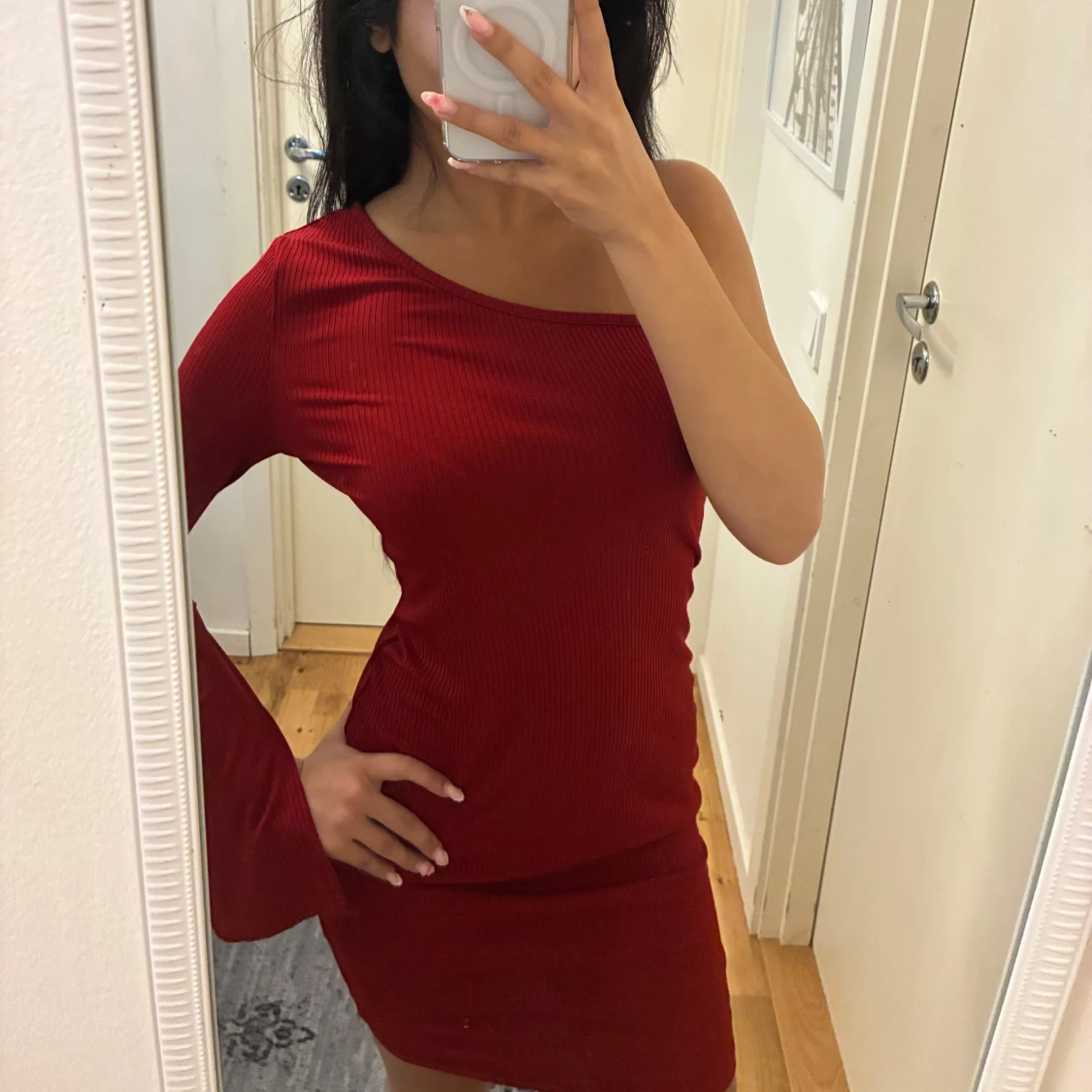 Säljer en tight röd ribbad kortklänning med one shoulder-design och lång trumpetärm på ena sidan. Klänningen har en figurnära passform och är perfekt för dig som vill sticka ut. Materialet är stretchigt och bekvämt.