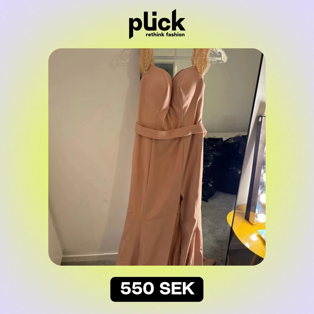 Elegant champagnefärgad långklänning med vackra spetsdetaljer på ryggen och axlarna. Klänningen har en figurnära passform och knappar längs ryggen. Perfekt för festliga tillfällen!