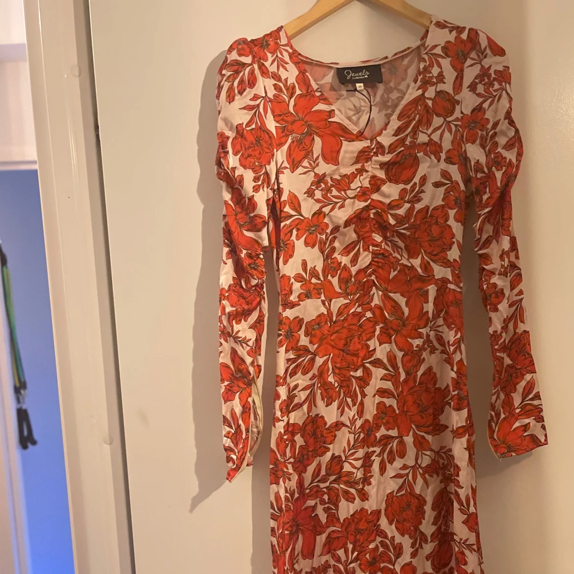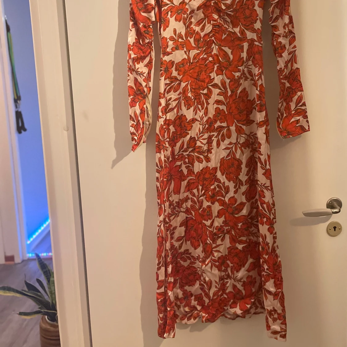Säljer en superfin långklänning från Positano med ett rött blommigt mönster på vit bakgrund. Klänningen har långa ärmar och en v-ringad design som ger en elegant look. Perfekt för vår och sommarens fester! 🌸