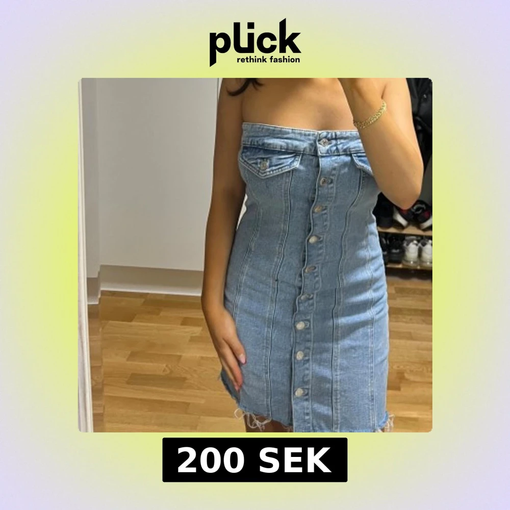 Säljer en snygg axelbandslös jeansklänning i ljusblå denim med knappar hela vägen framtill. Klänningen har rå kant nedtill och två dekorativa bröstfickor. Passformen är tight och klänningen är kort, perfekt för dig som gillar trendiga och coola plagg.