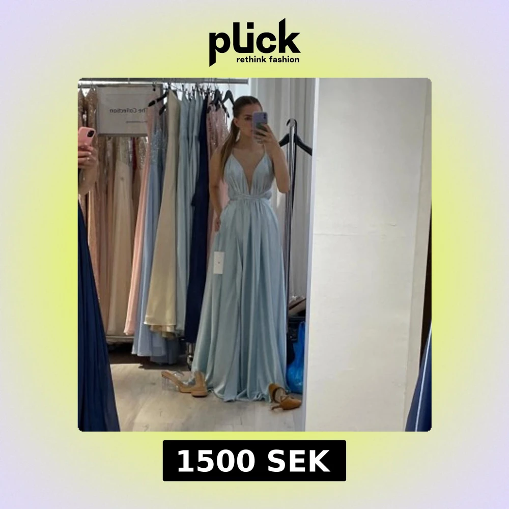 Säljer en elegant ljusblå långklänning med djup v-ringning och öppen rygg. Klänningen har smala axelband och ett fint fall i kjolen. Perfekt för bal eller festliga tillfällen. Materialet är glansigt och känns lyxigt. Jag är 163 cm och har klackar på bilderna. Klänningen är lätt uppsydd och går enkelt att lägga ned igen. Bara använd en gång. Storlek 0