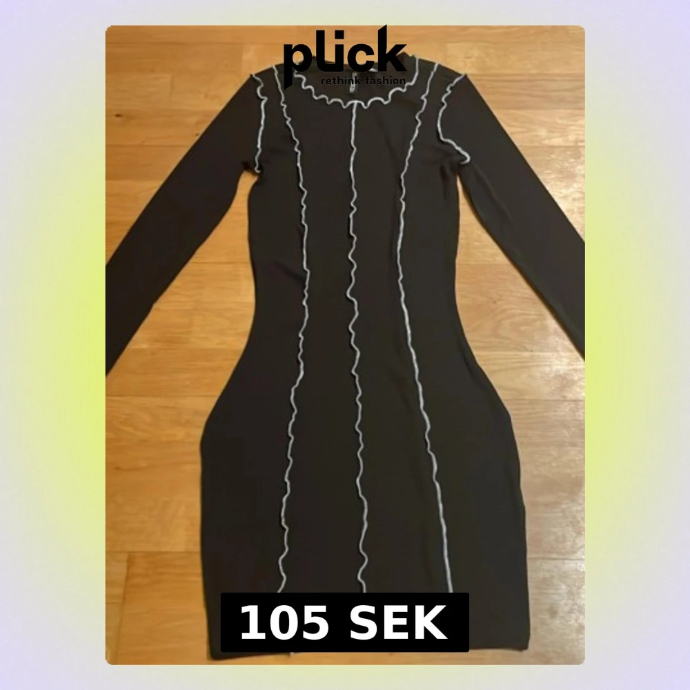 Säljer en svart bodycon klänning från Divided i storlek XS. Klänningen har långa ärmar och vita vågiga sömmar som detaljer längs hela plagget och vid halsen. Materialet är stretchigt och följsamt, perfekt för dig som gillar en tight passform. Säljer då den inte kommer till användning. Om ni har frågor så är det bara att höra av er!