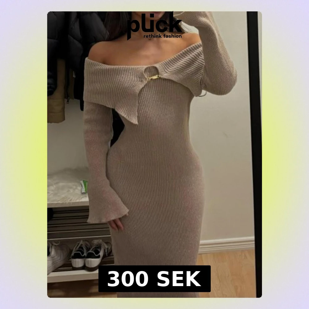 Trendig beige stickad långklänning med offshoulder-design och dekorativ metallring framtill. Klänningen har lång ärm med lätt utsvängda ärmslut och figurnära passform som framhäver siluetten. Perfekt för dig som vill ha en stilren och modern look.