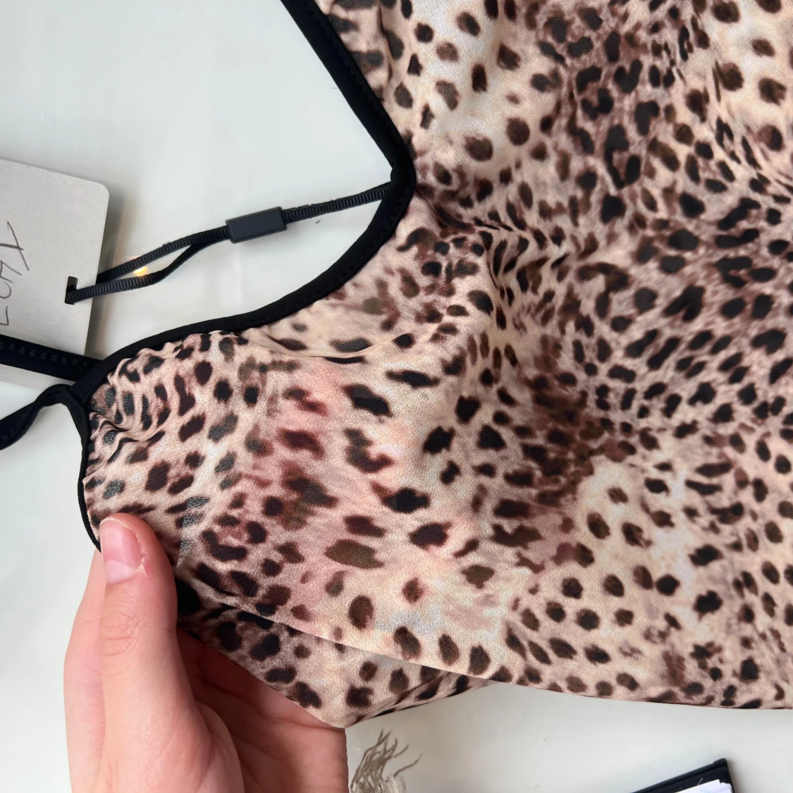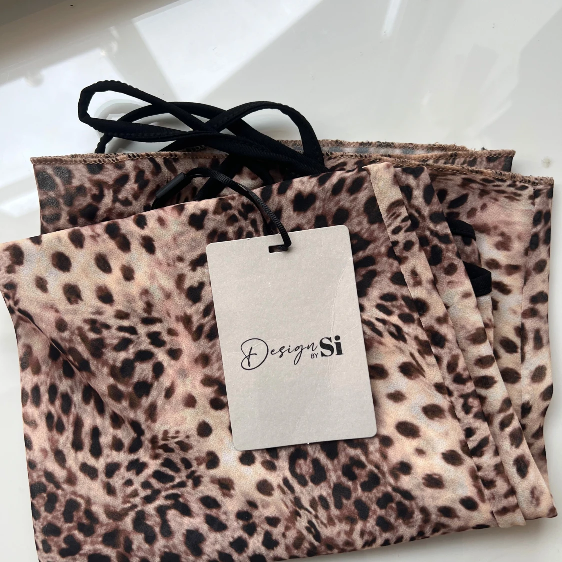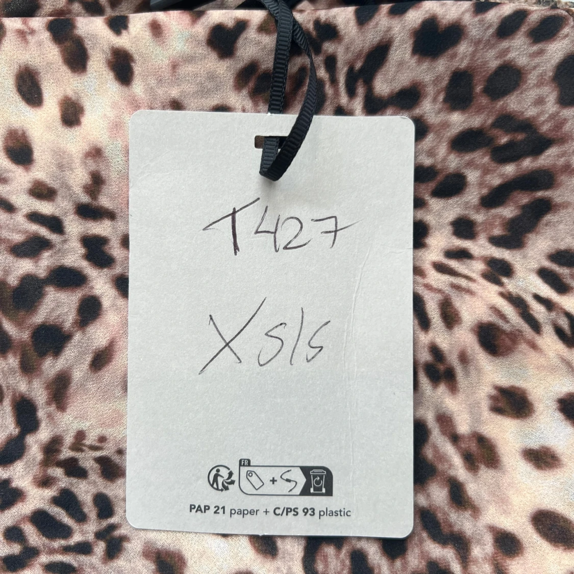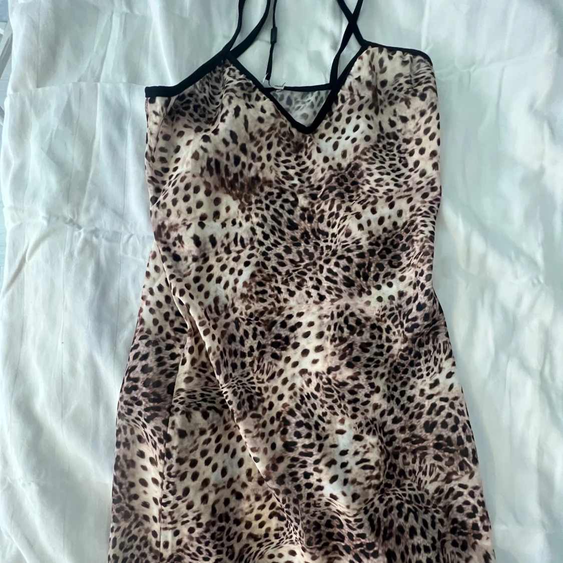 Snygg kort klänning från Design by Si med leopardmönster i beige och bruna toner. Klänningen har tunna axelband och v-ringad halsringning med svarta detaljer. Lite genomskinlig men perfekt till stranden eller styla. Längd=62cm Midja=34cm Byst=32cm storlek XS/S Aldrig använd