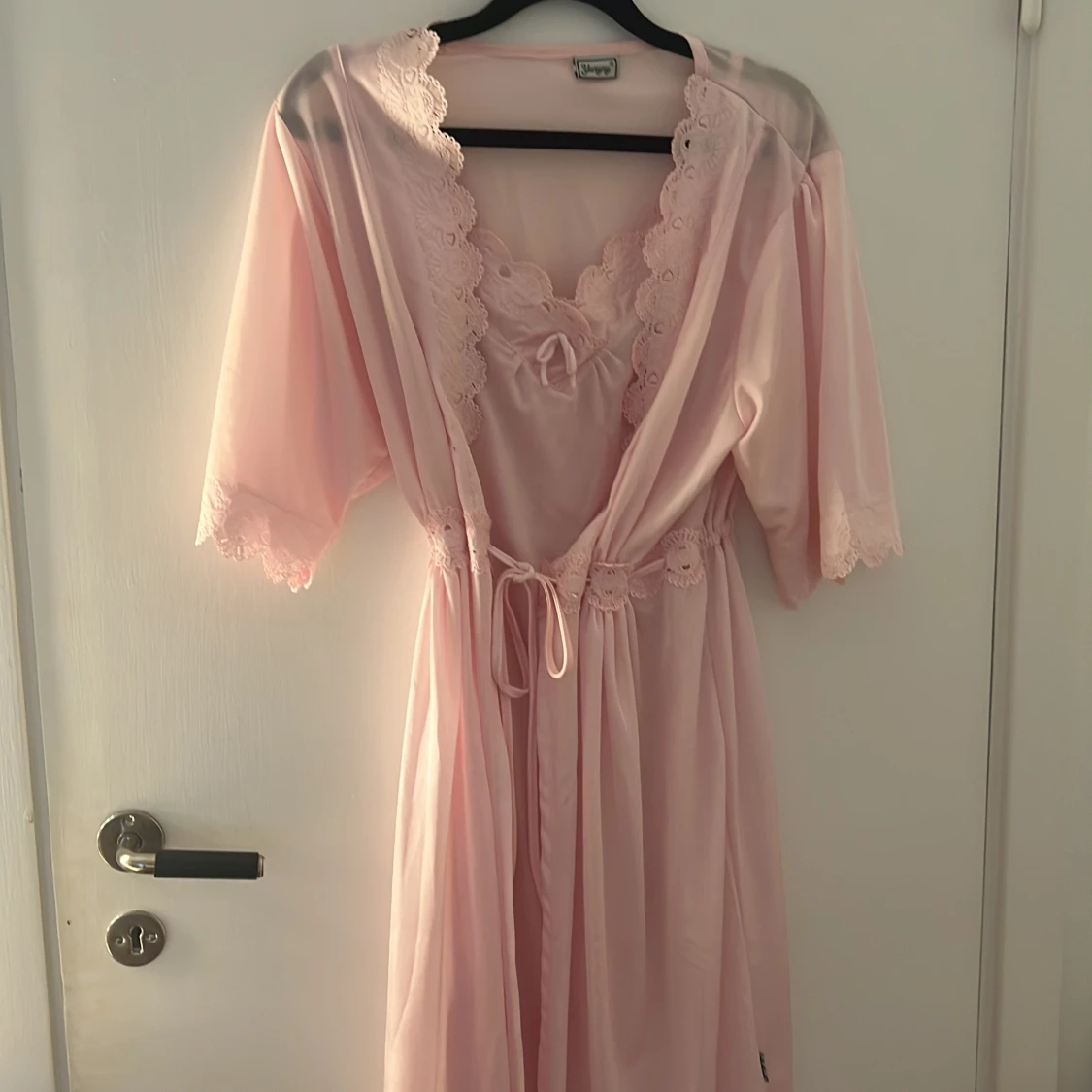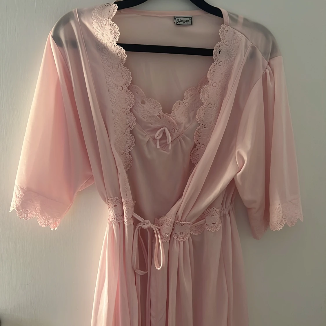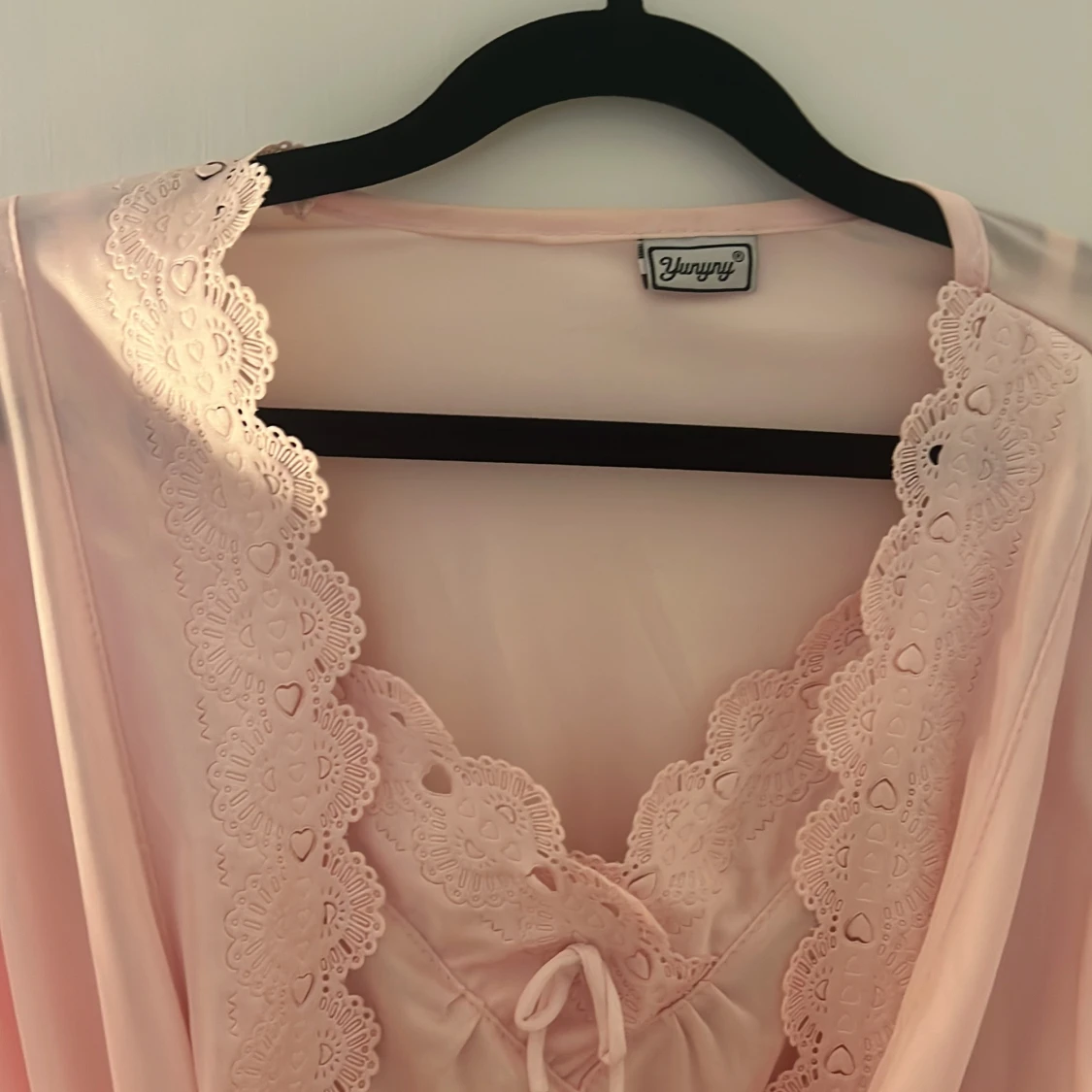 Supersöt ljusrosa omlottklänning från Yunyny med spetsdetaljer längs kanterna och ärmarna. Klänningen har knyt i midjan och v-ringad hals med fina broderade spetsmönster. Perfekt för dig som gillar romantisk och feminin stil.