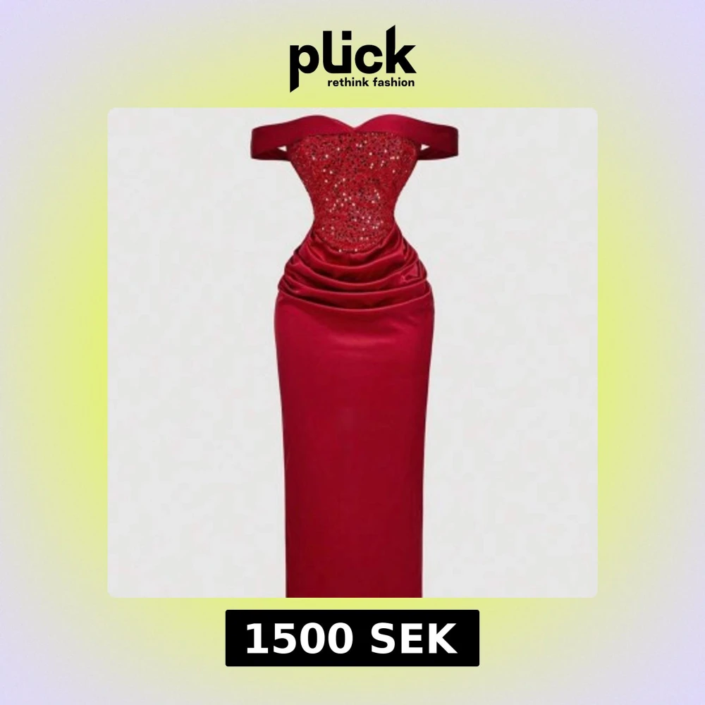 Snygg röd långklänning med axelbandslös design och glittriga paljetter över bysten. Klänningen har draperad midja och figurnära passform som ger en elegant siluett. Perfekt för dig som vill sticka ut med glamour och stil.