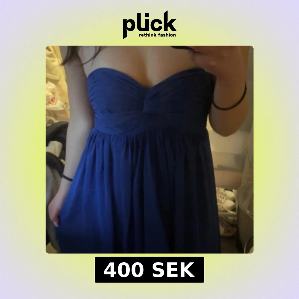 Säljer en elegant blå axelbandslös klänning med draperad detalj vid bysten. Perfekt för festliga tillfällen. Klänningen har en smickrande passform och ett flödande tyg som ger en vacker siluett.
