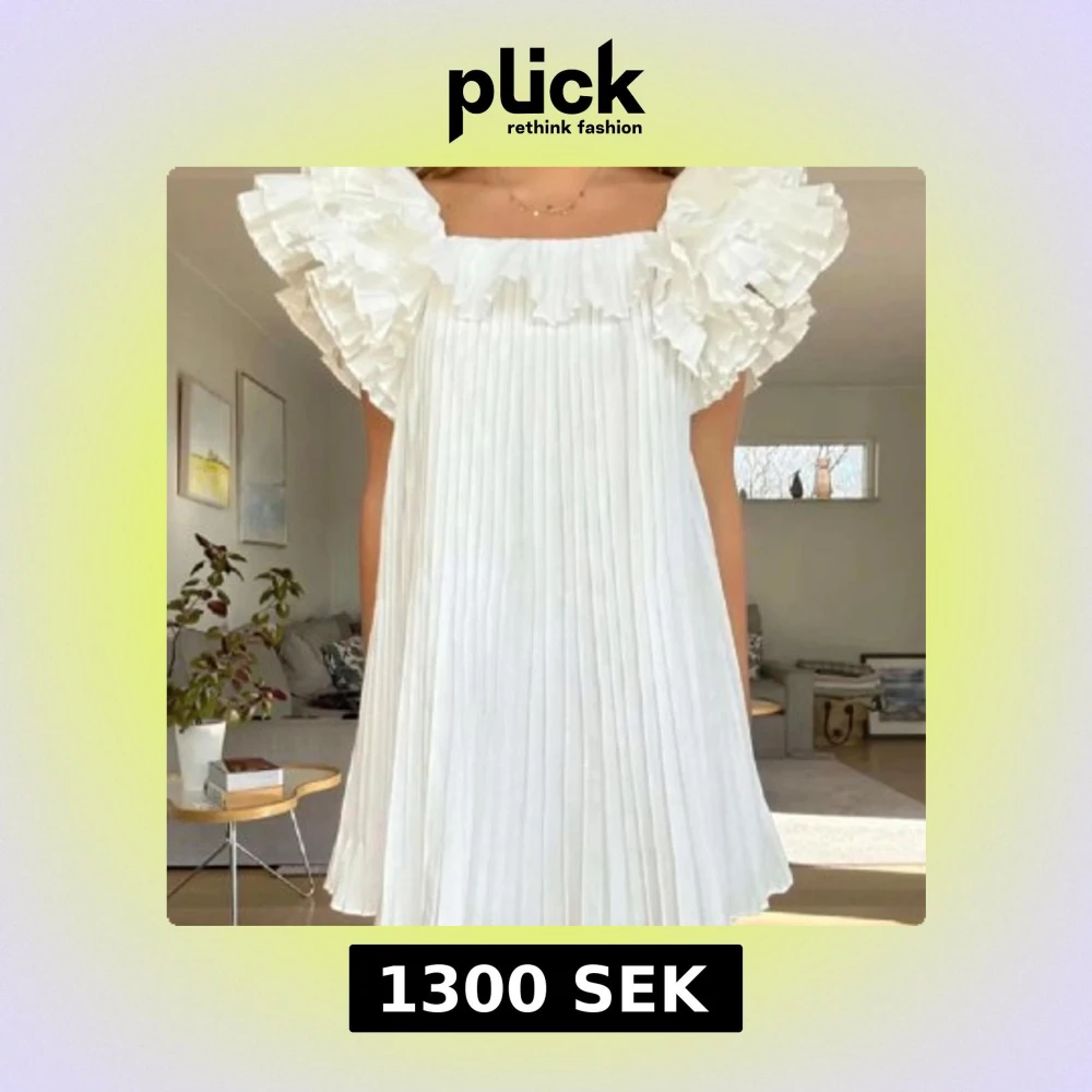 Superfin vit kortklänning med plisserat tyg och stora volangärmar. Väldigt populär och eftertraktad! Perfekt för sommarens alla tillfällen.