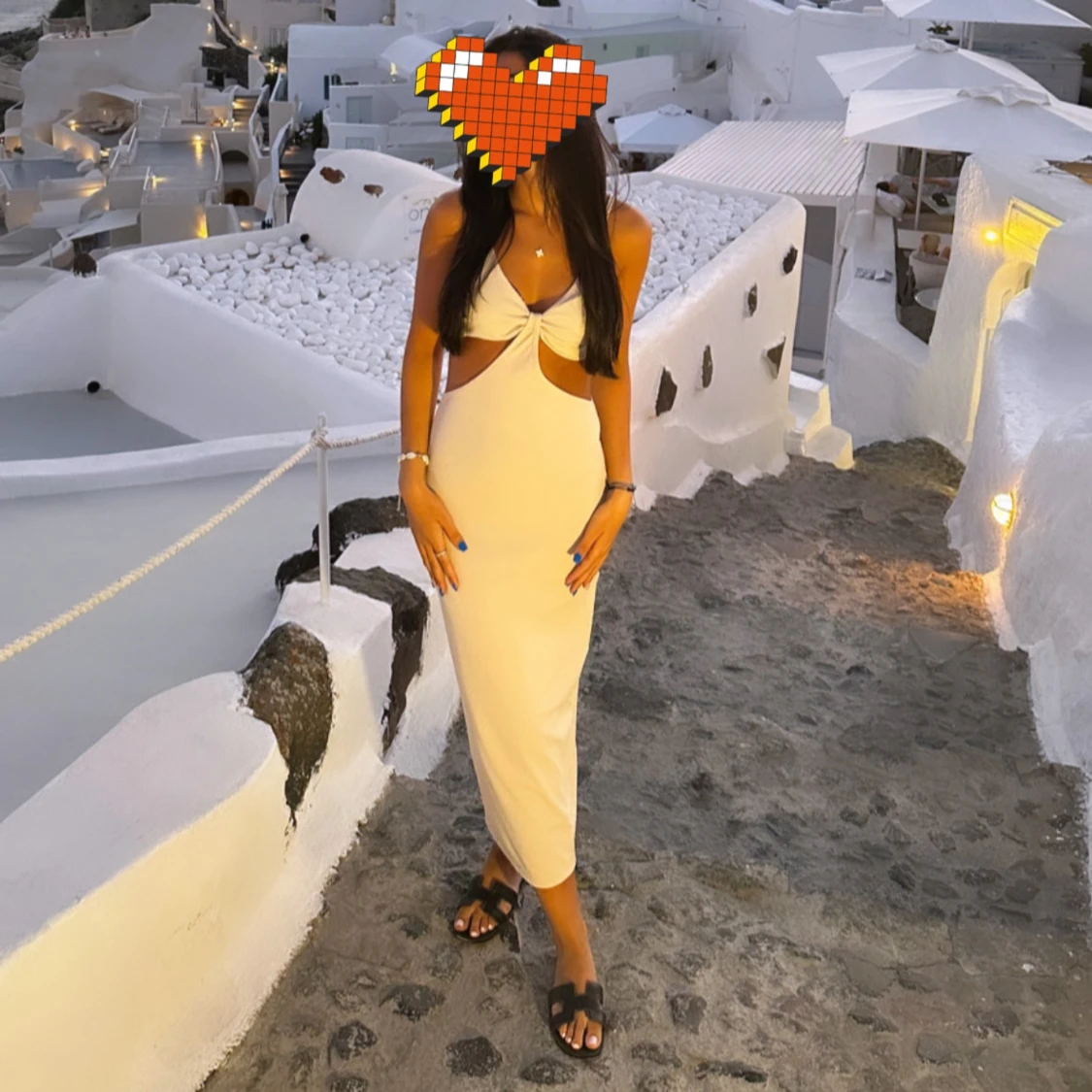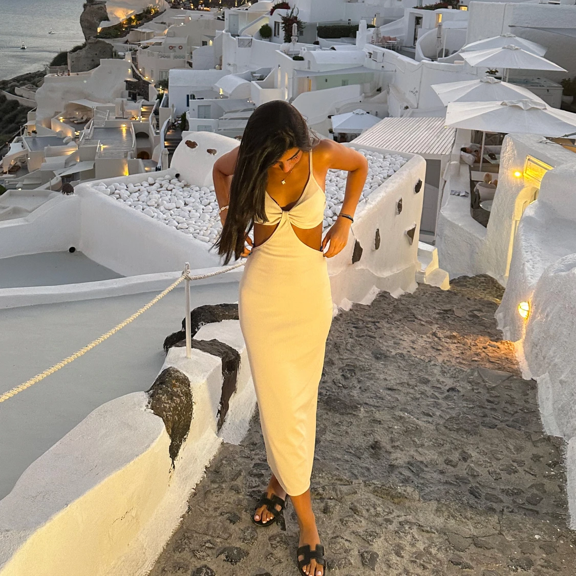 Supersnygg långklänning i champagnefärg med smala axelband och trendiga cut-outs vid midjan. Klänningen har en twistad detalj framtill och figurnära passform som framhäver siluetten. Perfekt för varma sommarkvällar och semester vibes.