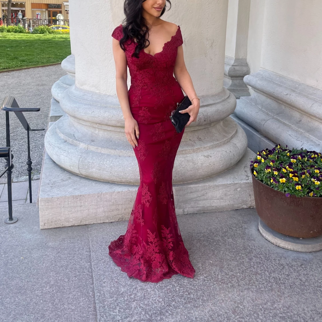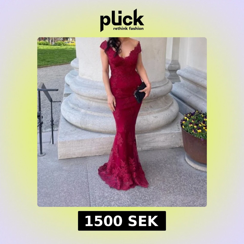 Säljer en elegant vinröd långklänning med v-ringning och spetsdetaljer. Klänningen har figurnära passform och vackra volanger vid axlarna. Perfekt för bal eller fest. Bärs med en svart clutch för extra stilpoäng. Märke : Goddiva x. Stepanie pratt . Sista bilden är klänningens baksida . Använts endast 1 gång
