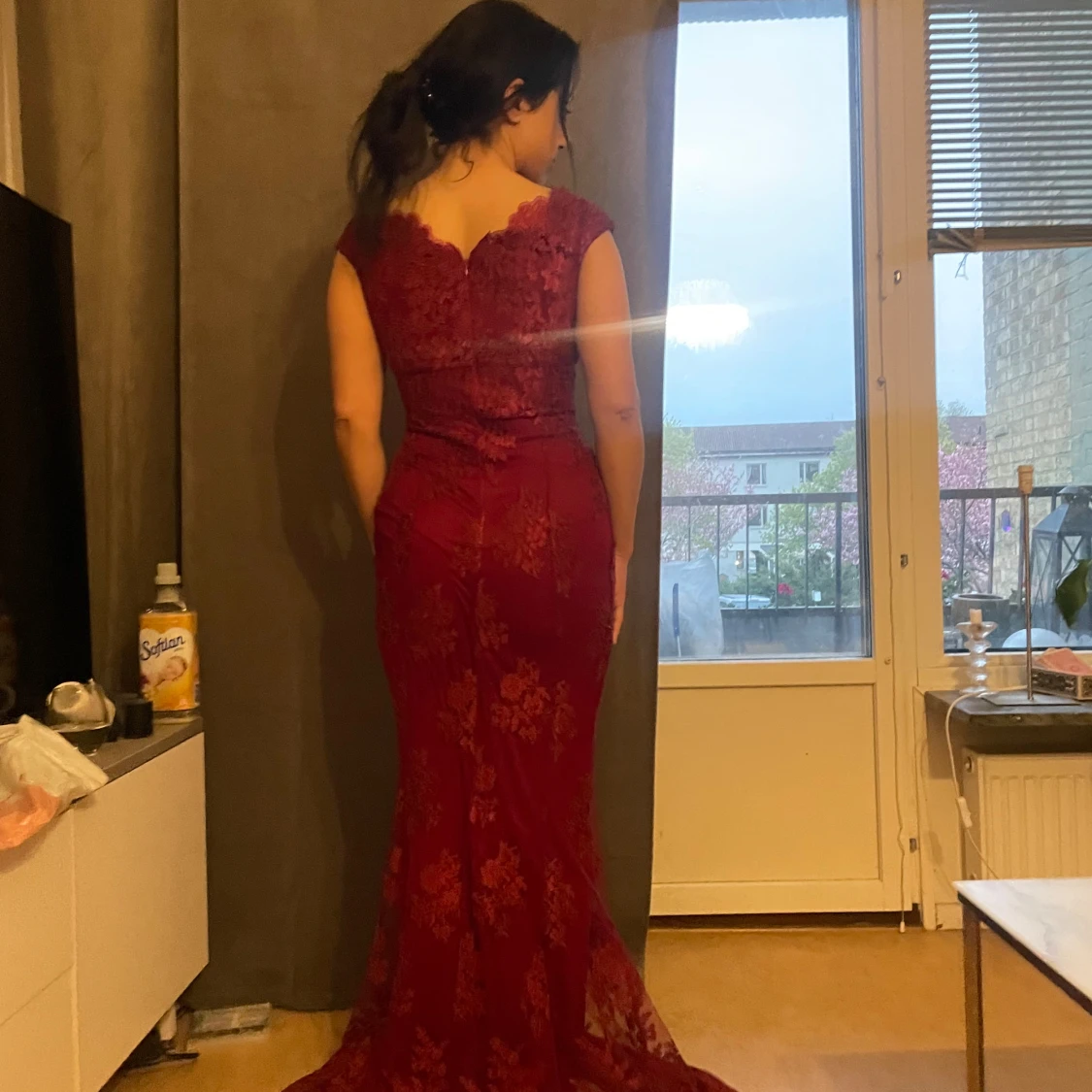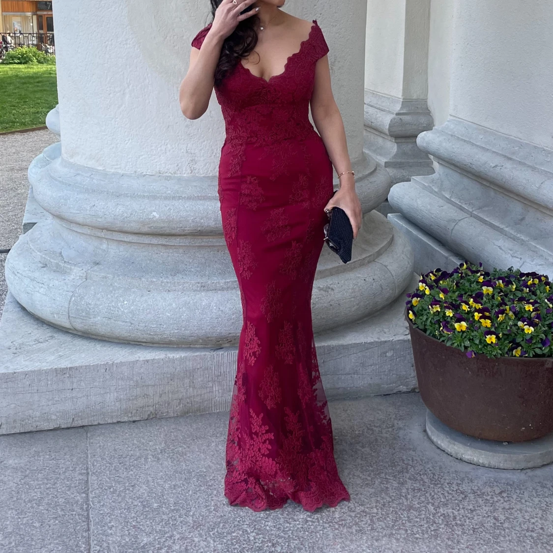 Vinröd långklänning med spetsdetaljer