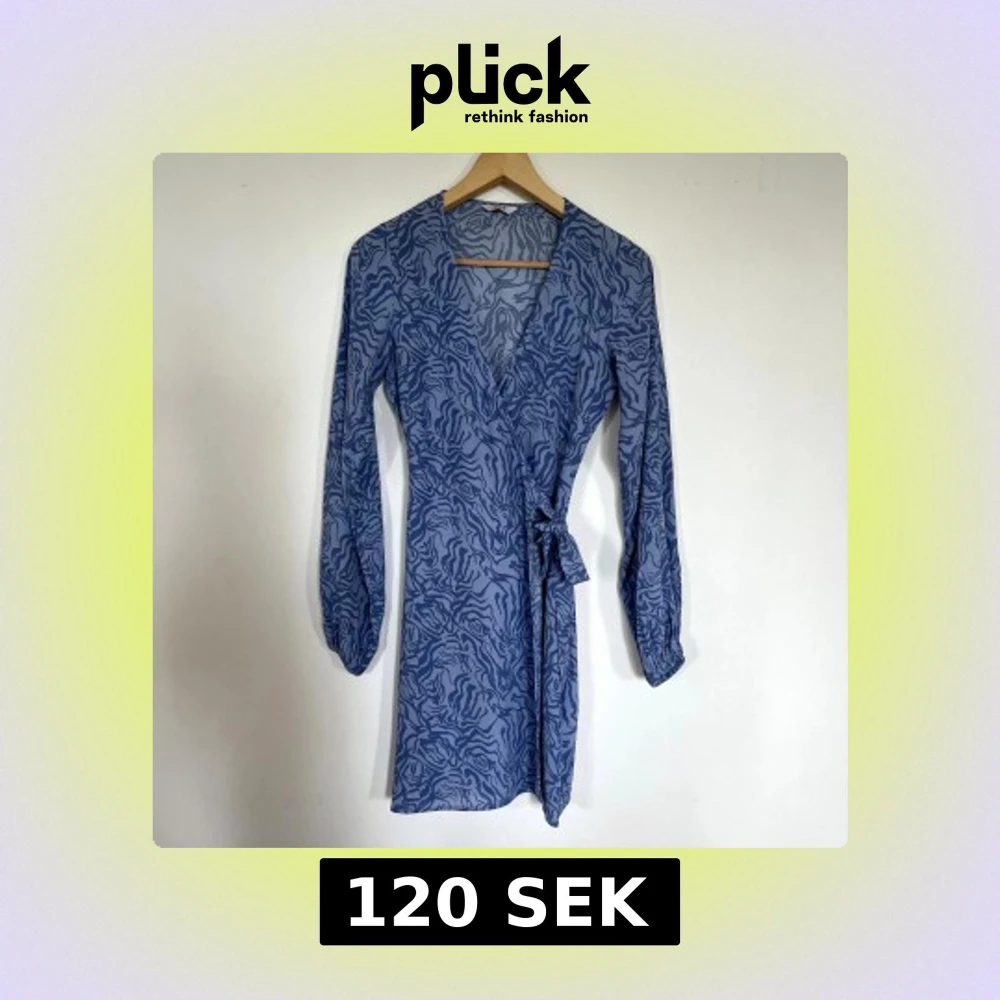 Omlottklänning med v-ringning och knyt i midjan. En aning liten för mig som brukar ha S-M i klänningar