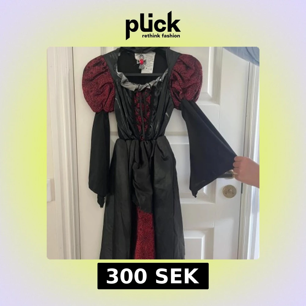 Cool HALLOWEEN klänning passar till 5-8 år, med puffärmar och snörning framtill. Klänningen har röda detaljer med spindelnätsmönster och trumpet-ärmar. Perfekt för halloween eller temafest när du vill sticka ut med en dramatisk look. Sömmen i kragen har spruckit lite(lätt att laga) , annars helt i nyskick. Nypris 750 kr.