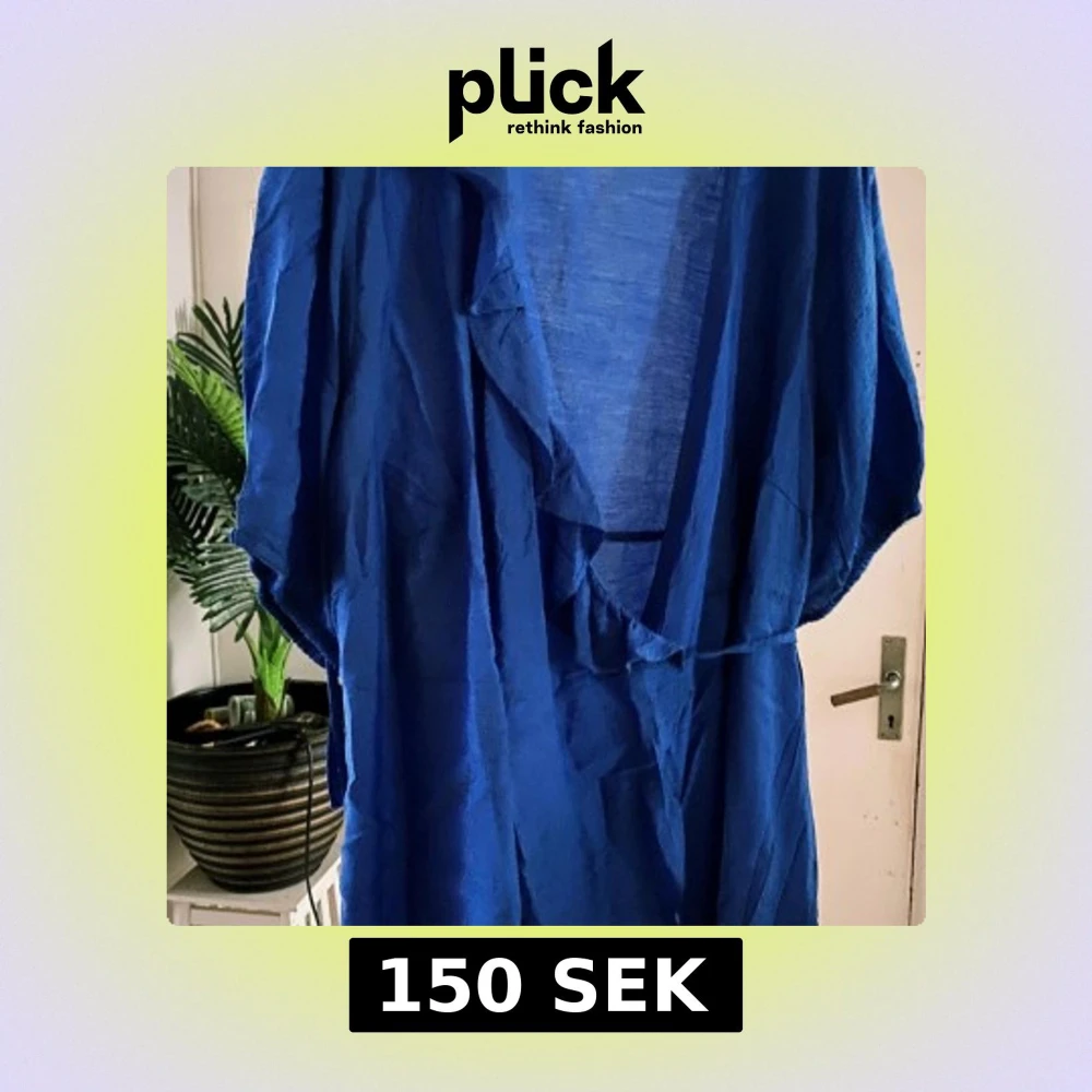 Snygg blå omlottklänning från Zizzi i storlek XXL. Klänningen har korta ärmar, volangdetaljer längs urringningen och knytband i midjan. Tillverkad i ett lätt och luftigt tyg som passar perfekt för varmare dagar.