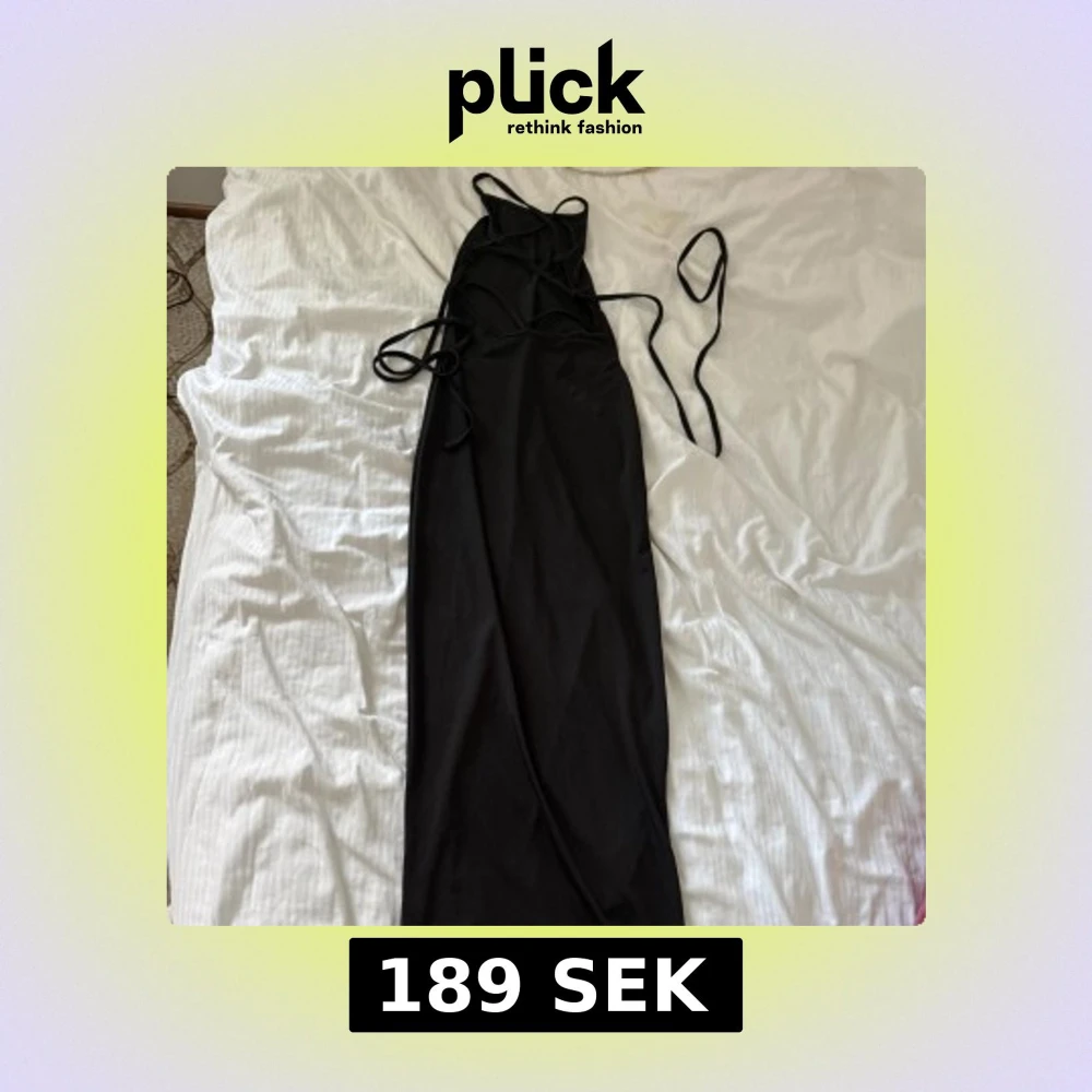 Säljer en svart långklänning med smala axelband och snygga snörningsdetaljer över ryggen. Klänningen har en figurnära passform och är ärmlös, perfekt för dig som vill sticka ut med en stilren och trendig look.