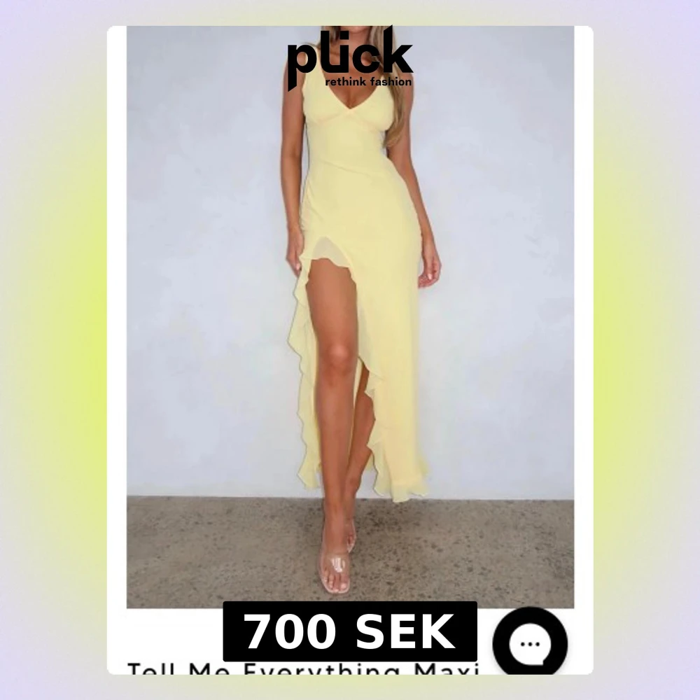 Snygg ljusgul maxiklänning med djup V-ringning och hög slits framtill. Klänningen har volangkant längs slitsen och är ärmlös med figurnära passform. Perfekt för sommarens alla tillfällen. Materialet ser ut att vara ett lätt, flytande tyg.