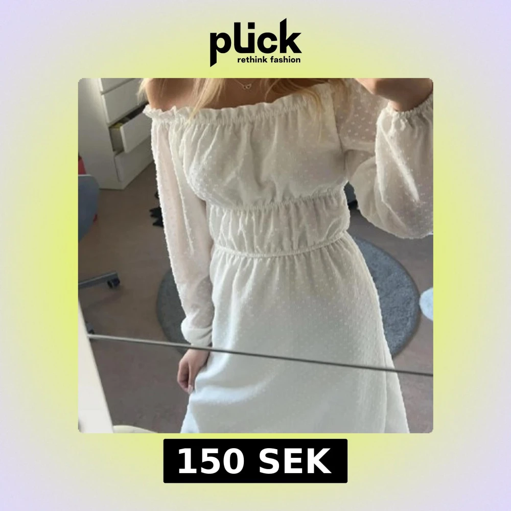 Superfin vit klänning med offshoulder och långa ärmar. Klänningen har resår i midjan och runt axlarna för en snygg passform. Tunt, lätt material med diskret prickigt mönster. Perfekt för sommarens alla tillfällen!
