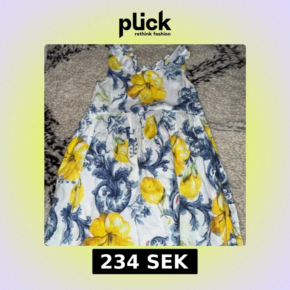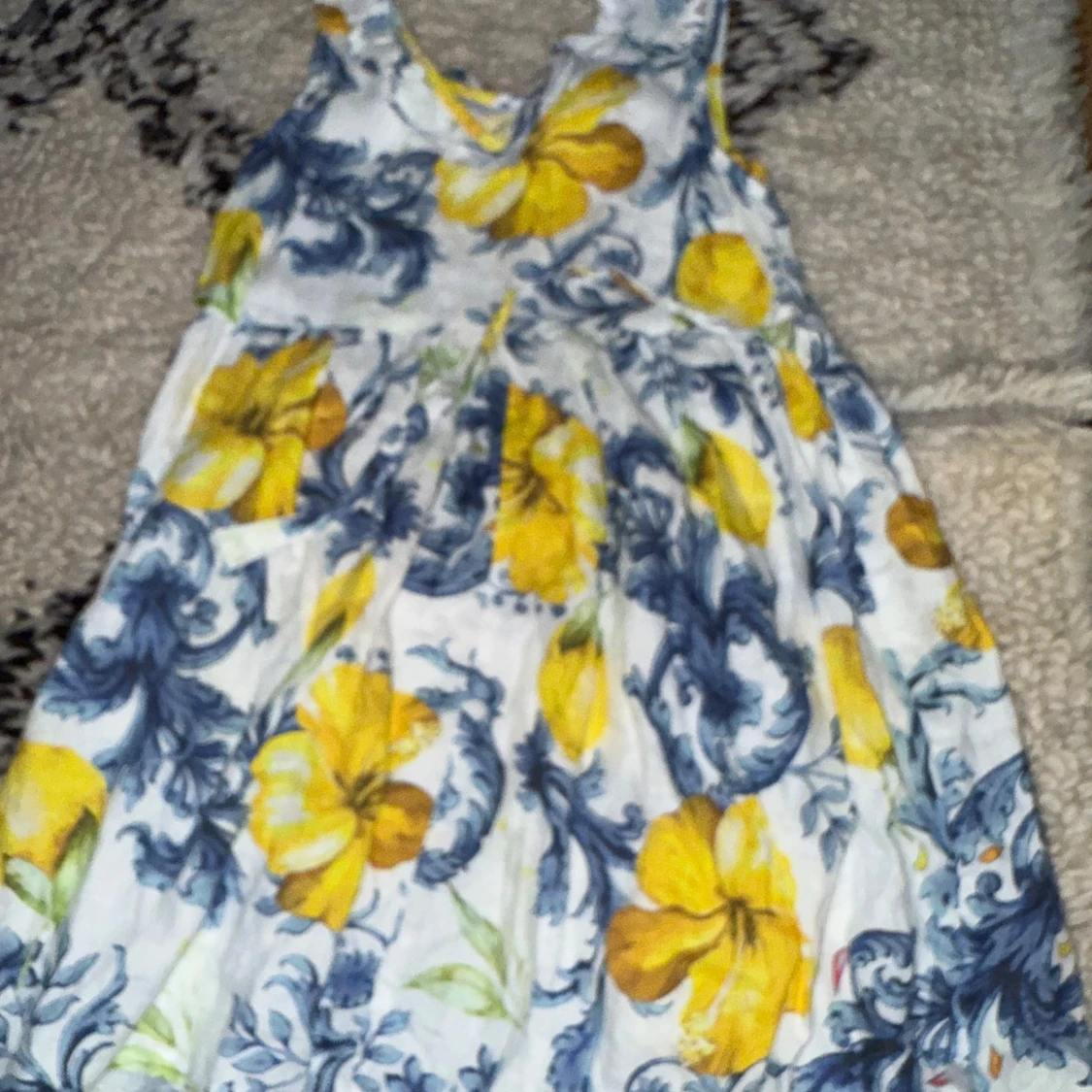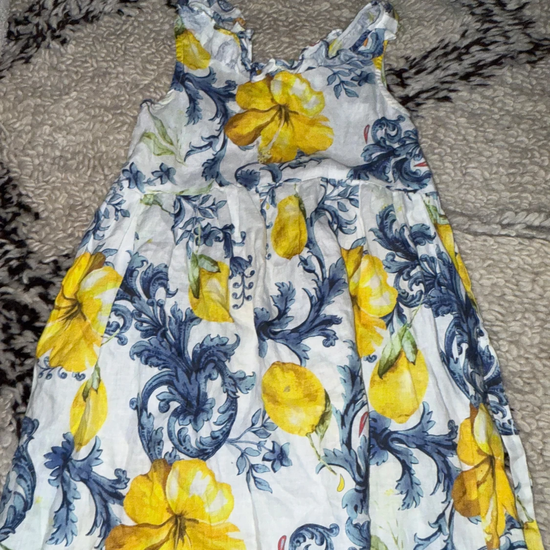 Klänning med gula citroner och blå blom detaljer. Bra skick. Storlek: xxs