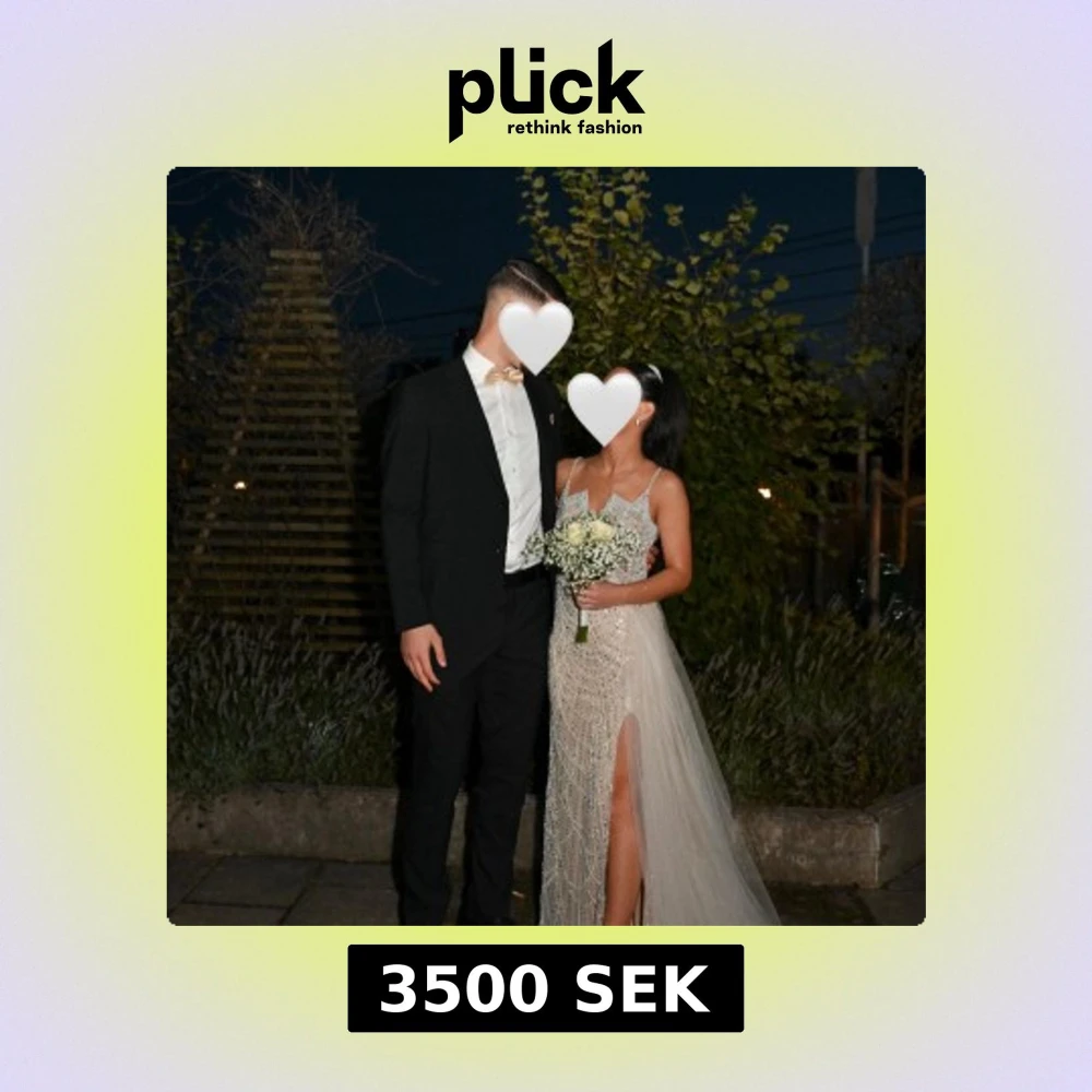 Elegant klänning i glittrigt material med en djup v-ringning och hög slits. Perfekt för en festlig kväll. Storlek 32/34. Pris kan diskuteras🤍
