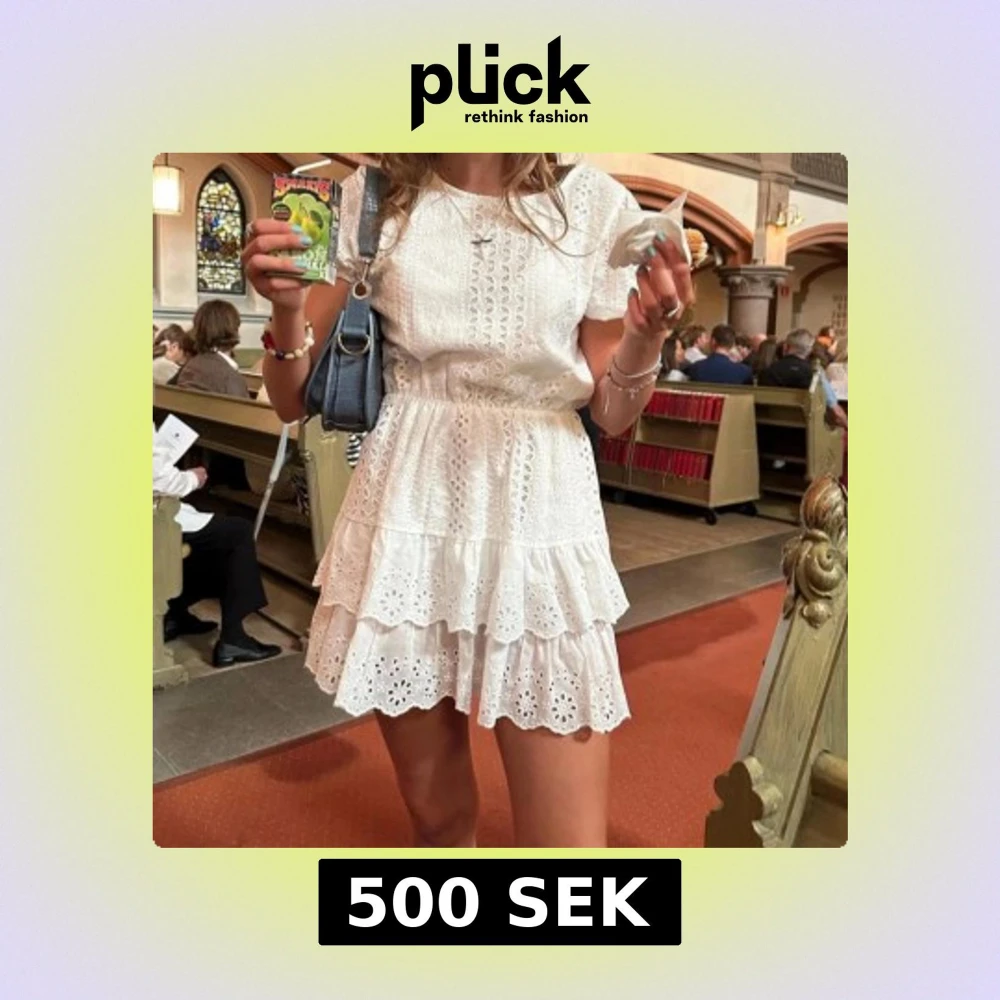 Perfekt till sommaren. Superfin vit kortklänning med broderade detaljer och volangkant. Klänningen har rund hals, korta puffärmar och markerad midja. Perfekt för sommarens alla tillfällen. Söt och feminin stil med romantisk känsla. Har krympt lite i tvätten så är mer som en xxs🩷