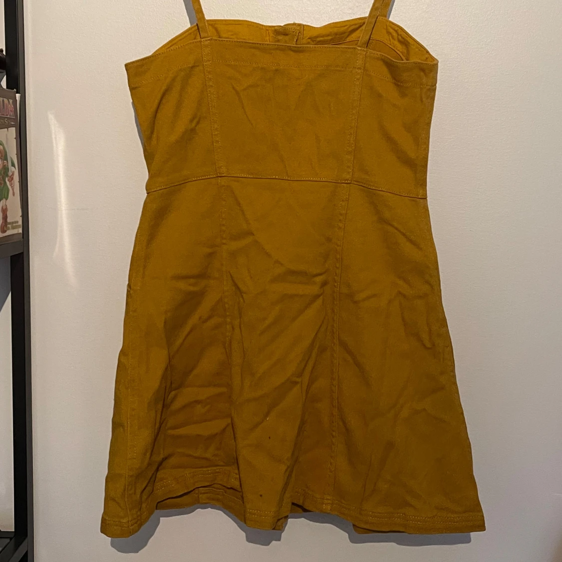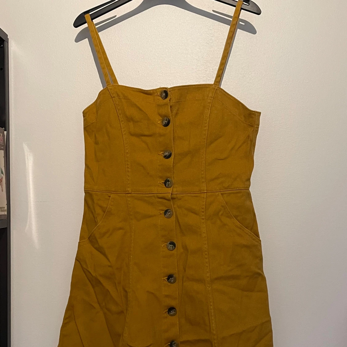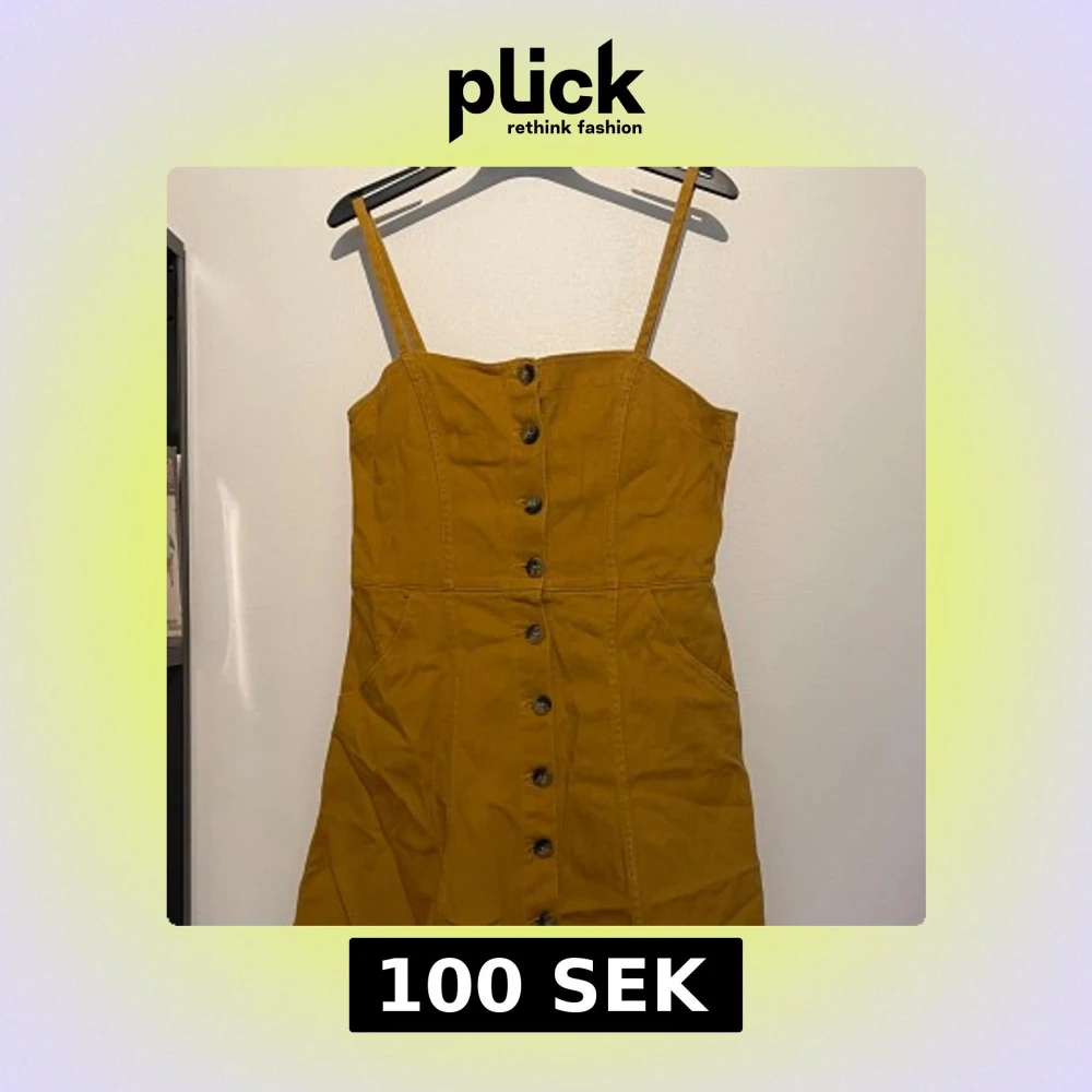 senapsgul klänning från HM. den har en figurnära passform upptill och lätt utställd kjol. perfekt nu när det börjar bli varmare. kommer från ett djur och rökfritt hem 🖤