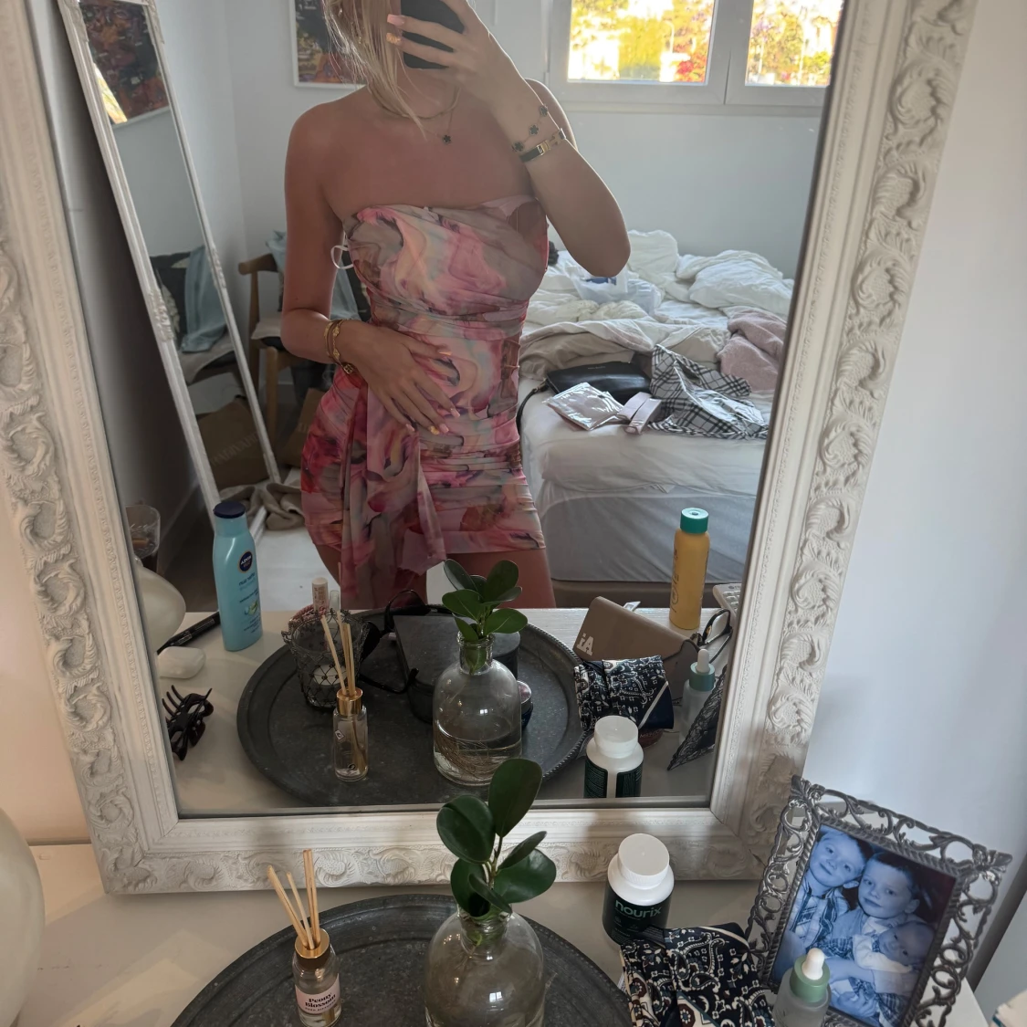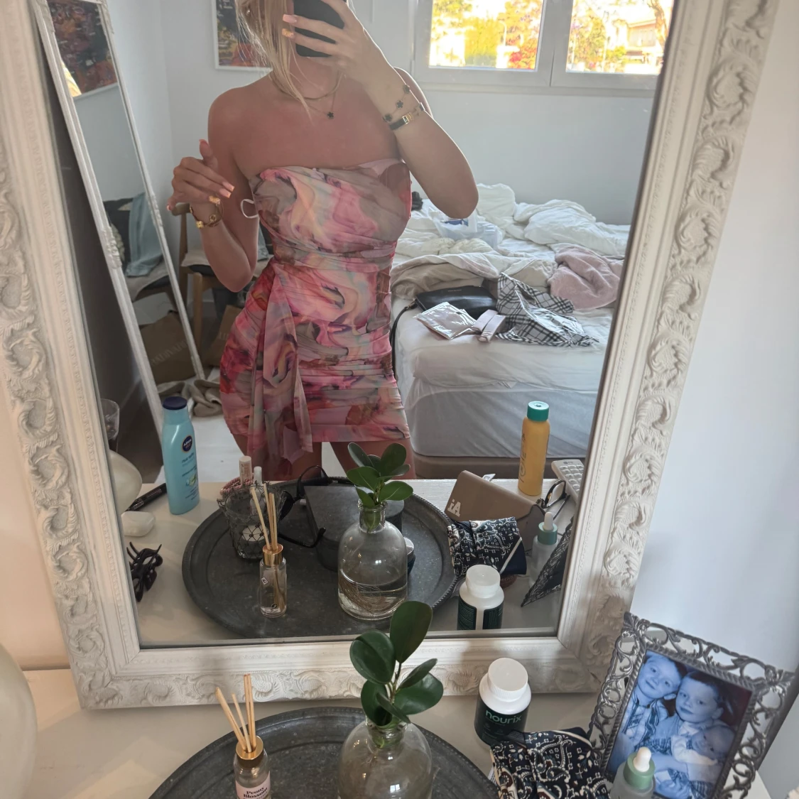 Säljer en axelbandslös kortklänning med färgstarkt mönster i rosa, lila och beige toner. Klänningen har omlottkänsla med knyt i sidan och en snygg drapering framtill. Perfekt för sommarens alla tillfällen!