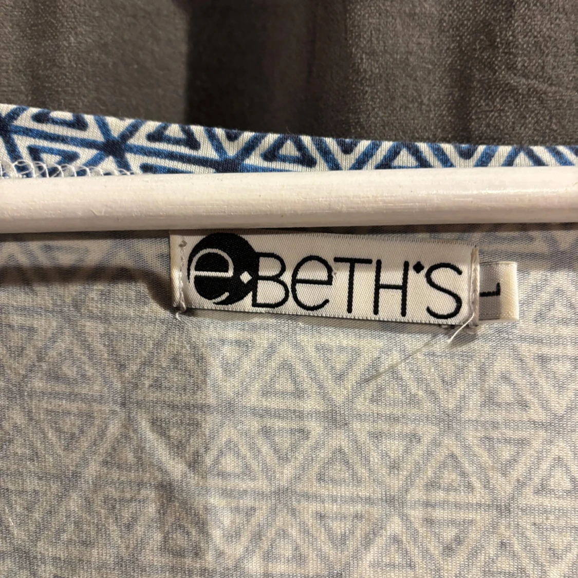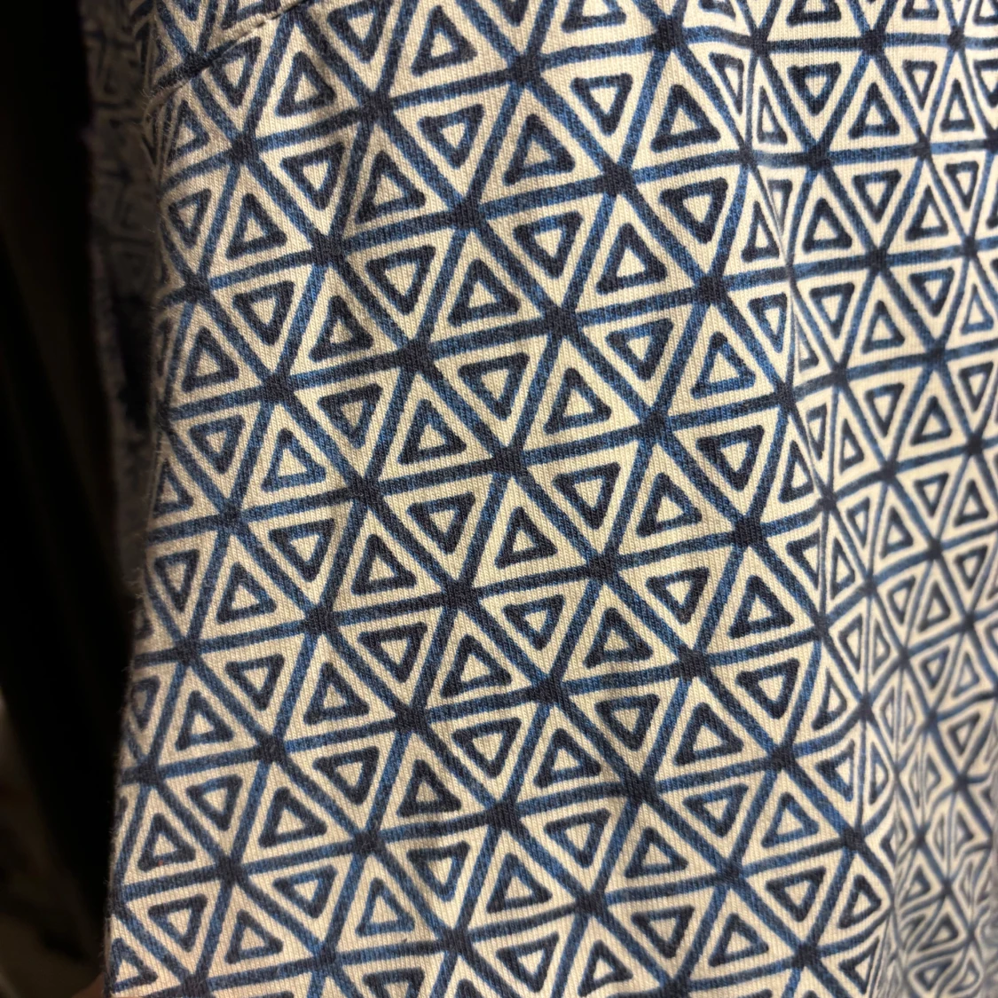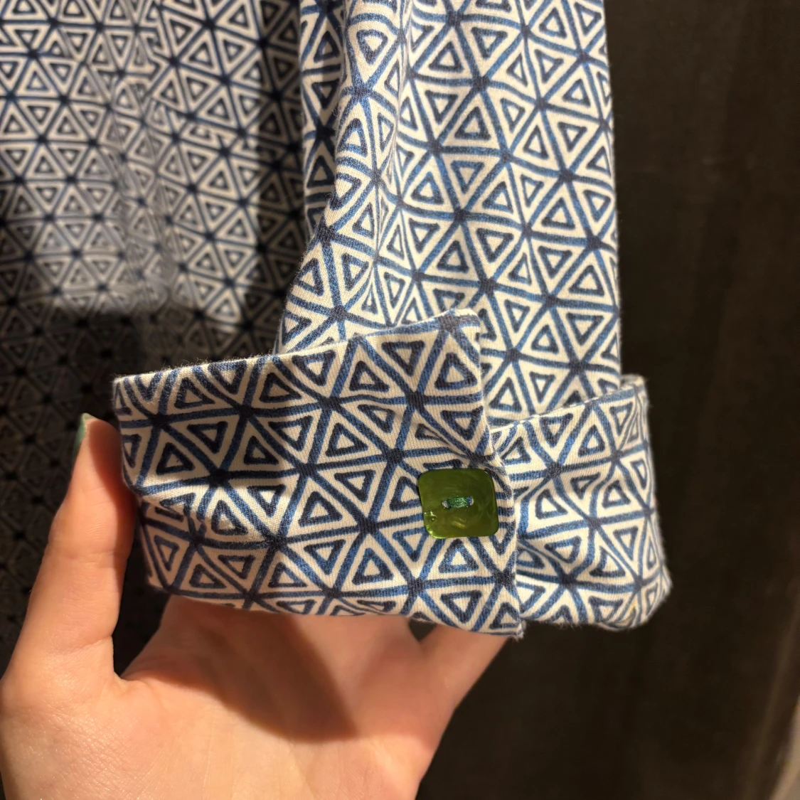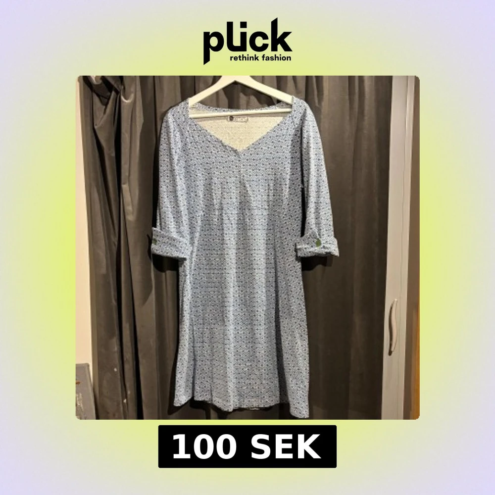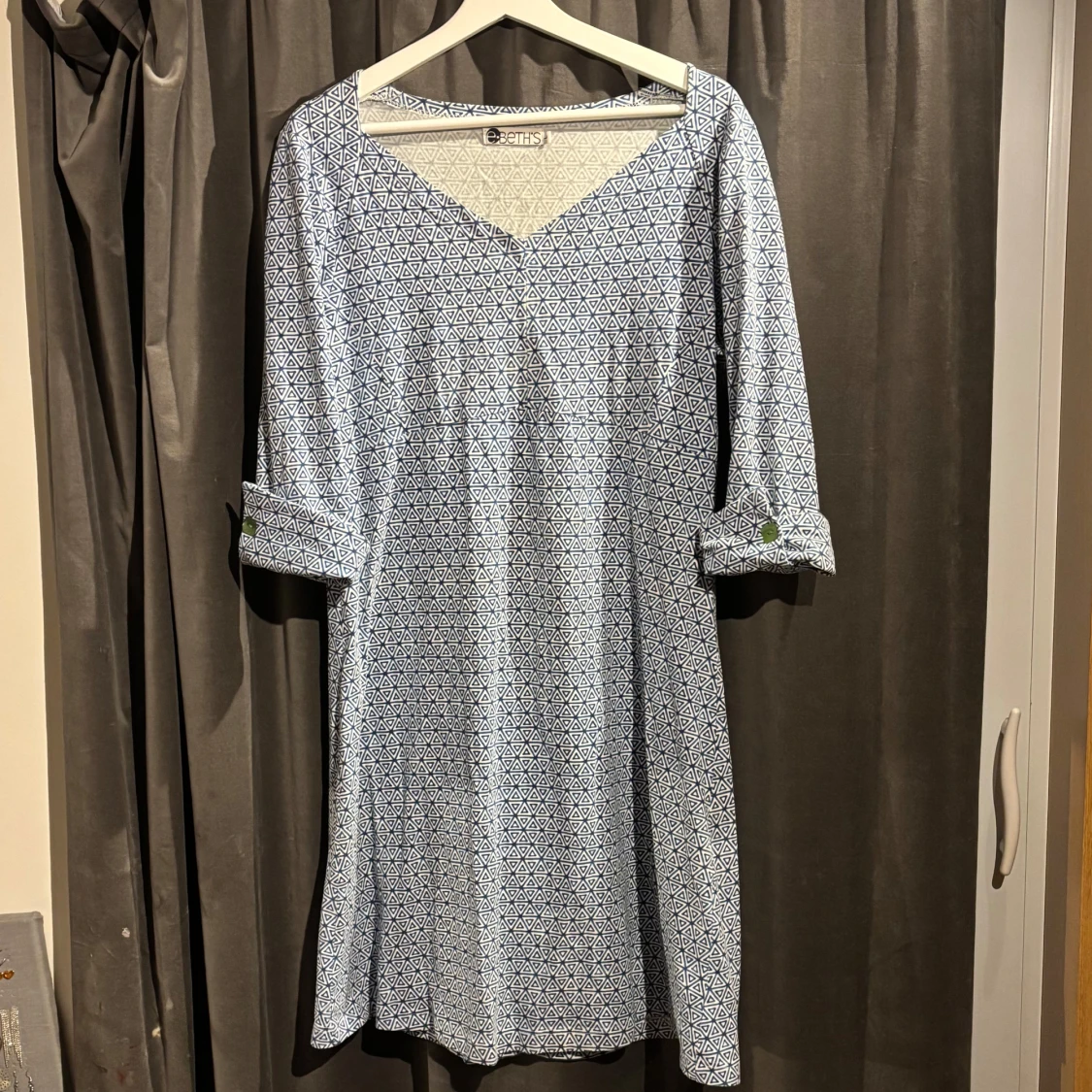 Snygg blå och vit klänning med geometriskt mönster från eBETH'S. Klänningen har trekvartsärmar med knappar och en v-ringad hals. Skriv gärna om eventuella frågor.💙