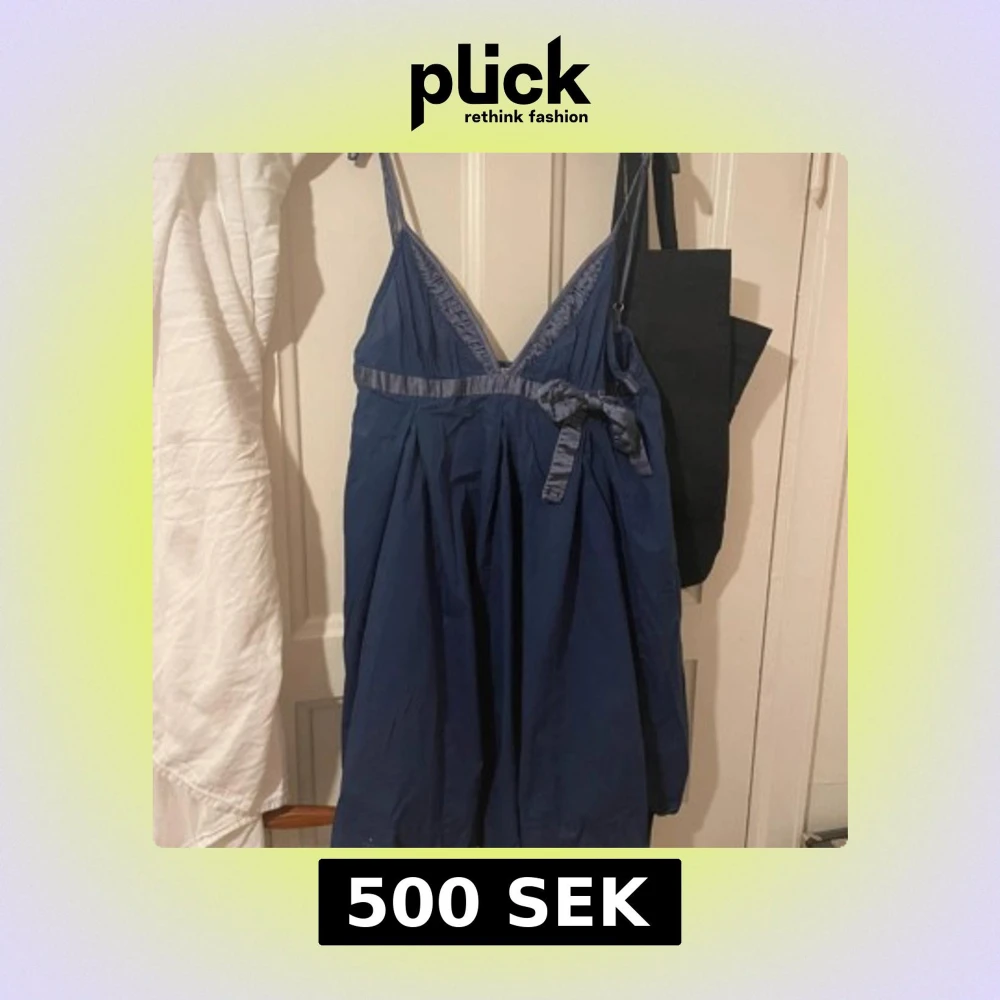 Snygg mörkblå klänning från Miss Sixty med smala axelband och en dekorativ rosett i midjan. Perfekt för en stilren look eller på en varm sommardag.