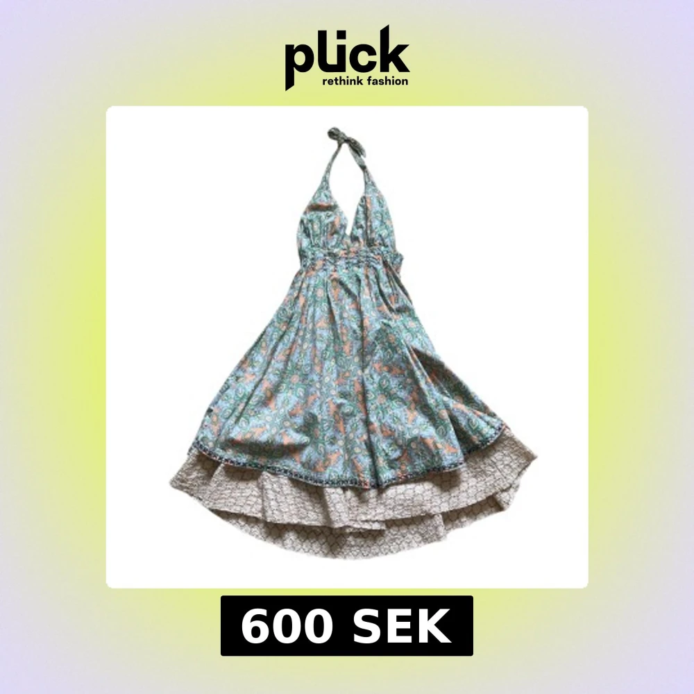 Snygg långklänning från Odd Molly med paisleyinspirerat mönster i grönt, orange och grått. Klänningen har halterneck med knyt, öppen rygg och dekorativa pärlemorknappar. Volangkant nertill och smock i midjan. Perfekt för sommarens alla tillfällen!