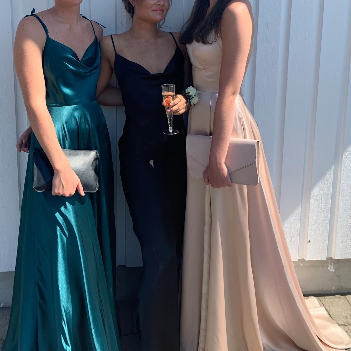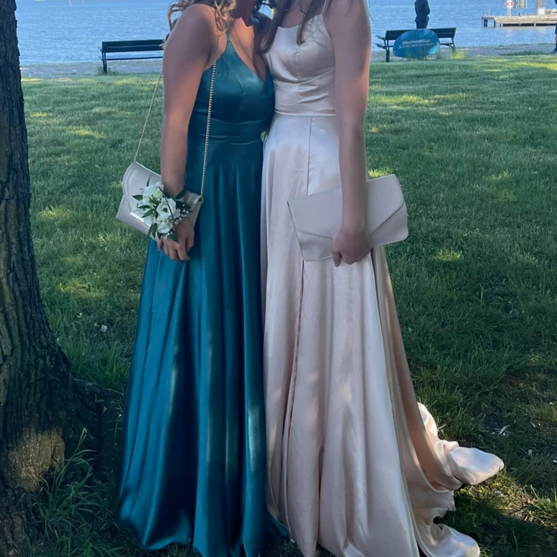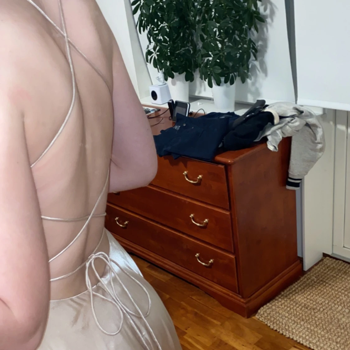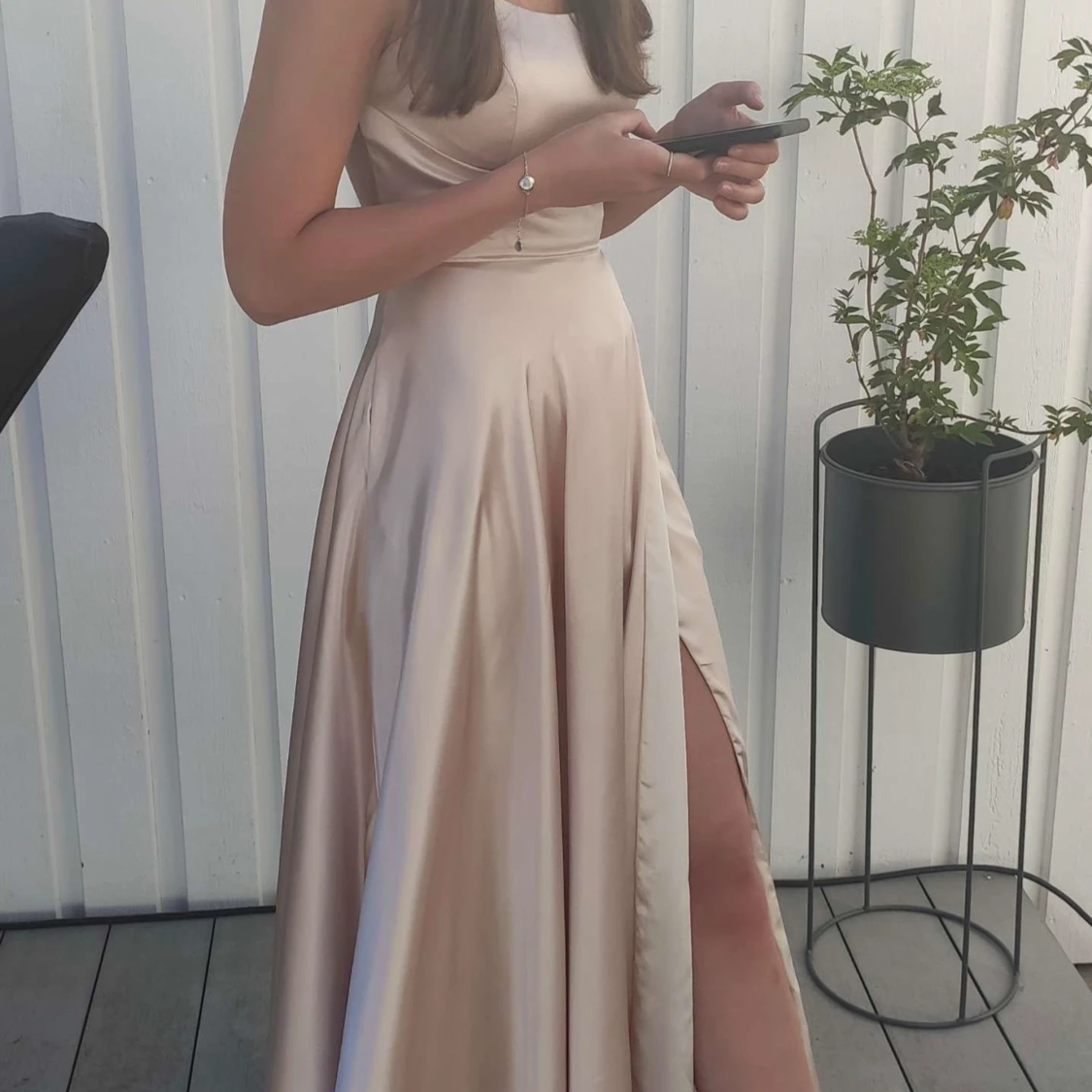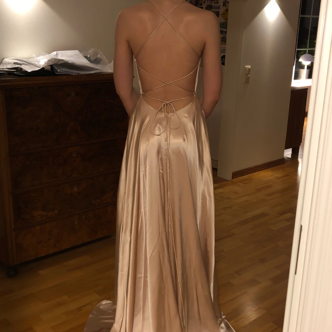 Underbar balklänning från YouMeFashion köpt 2021. Endast använd under en kväll och är försiktigt tvättad efter användning. I satinmaterial i en jättefin champange-rosa färg😍Öppen rygg med så charmig snörning och lite släp i kjolen. Köpt för 2890kr!!
