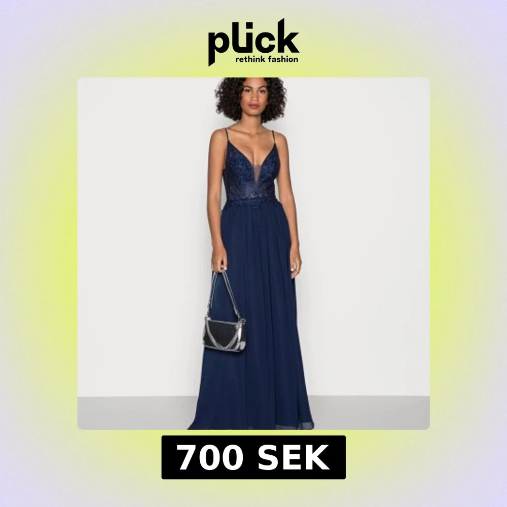 Elegant marinblå långklänning med smala axelband och djup v-ringning. Livet är dekorerat med spets och pärlor, vilket ger en lyxig känsla. Kjolen är i ett lätt, flytande material som faller snyggt. Perfekt för bal eller fest. Den är liten i storleken så skulle säga att den är mer som 38/40