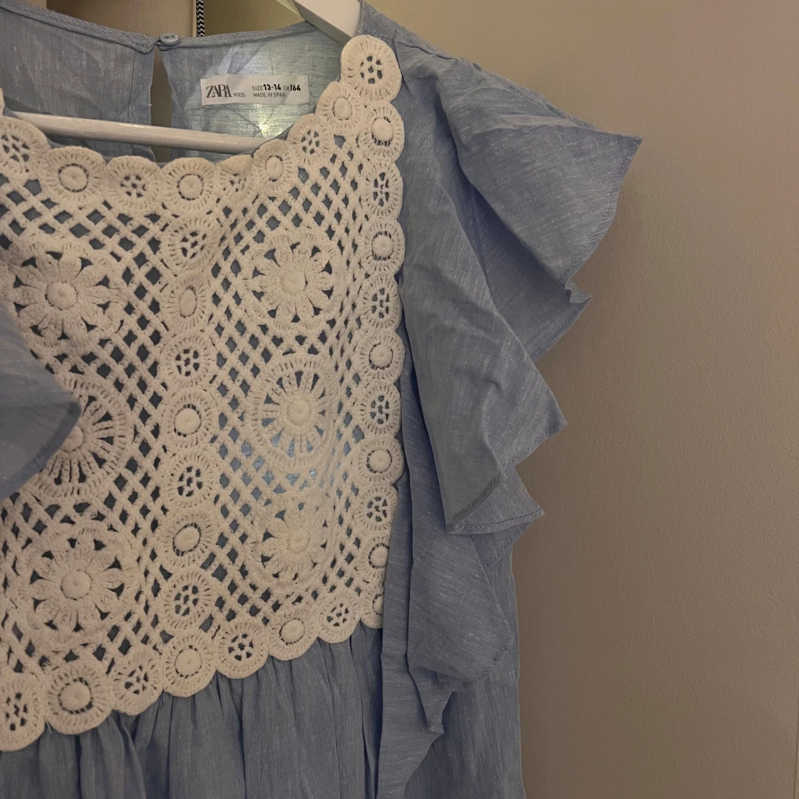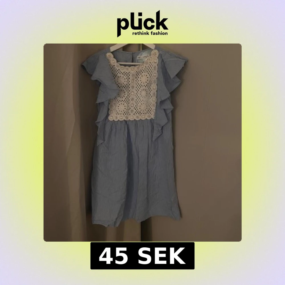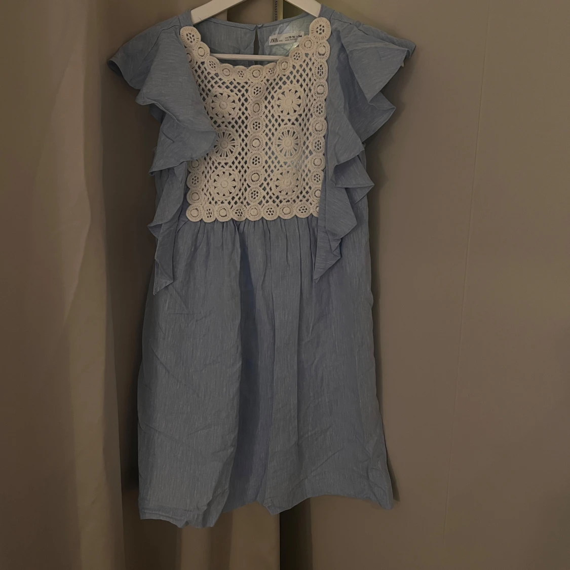 Säljer en söt blå klänning från Zara med vackra vita spetsdetaljer framtill. Klänningen har volanger längs sidorna och är ärmlös. Köpt på baravdelningen men kommer passa en xxs/xs