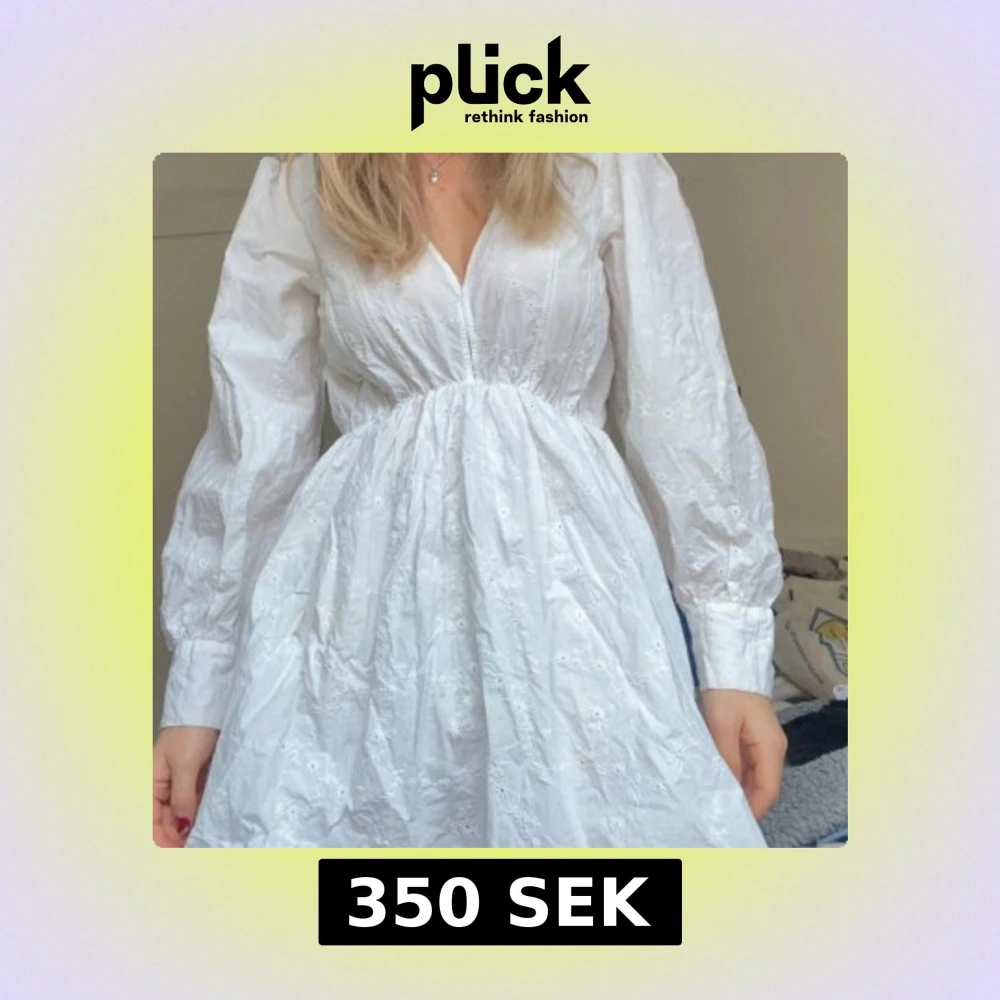 Superfin vit klänning med broderade blommor, v-ringning och långa puffärmar. Klänningen har markerad midja och är gjord i bomull, perfekt för sommarens alla tillfällen. Den har en romantisk och luftig känsla med fina detaljer.