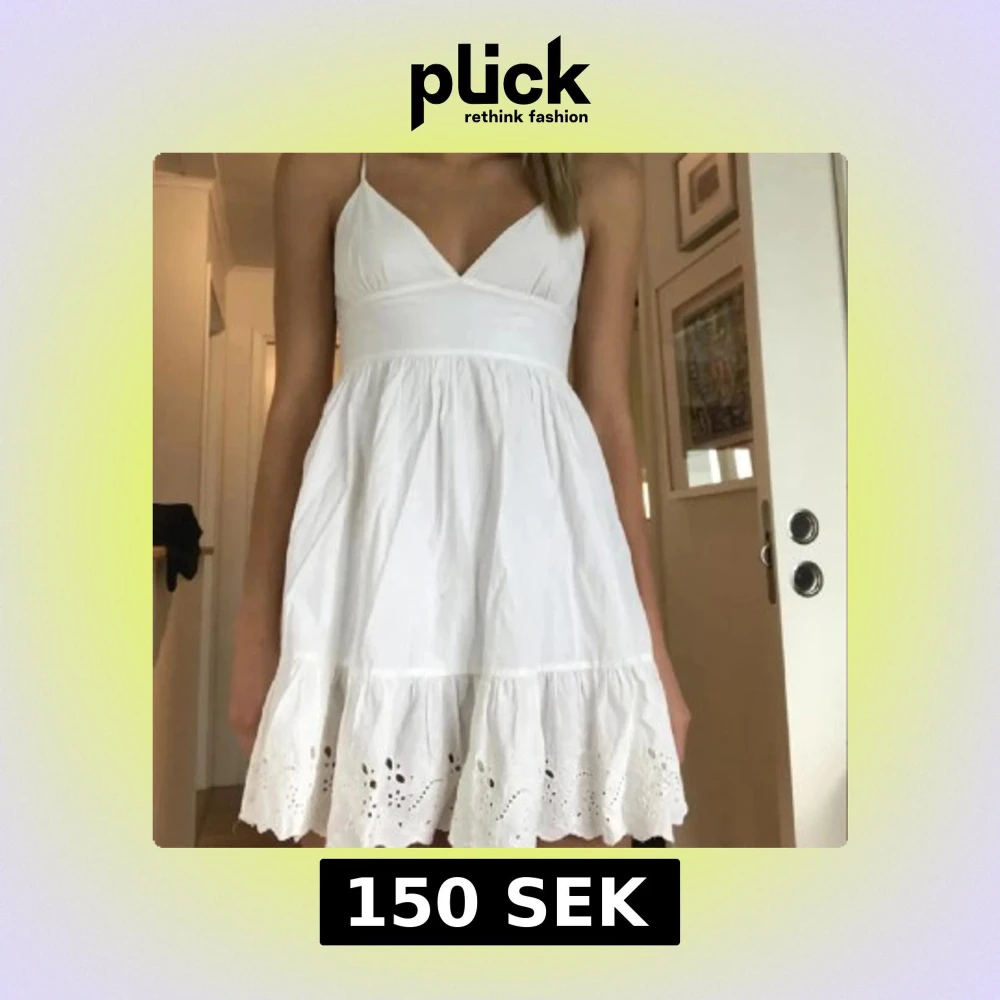 Söt vit klänning med smala axelband och v-ringad överdel. Kjolen är utsvängd med en broderad volang längst ner. Perfekt för varma dagar och midsommarfirande.