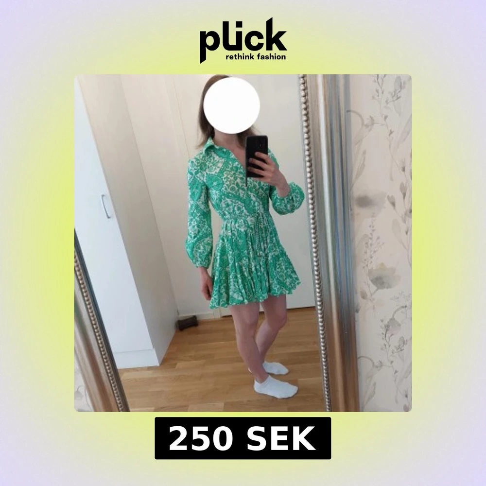 Supersöt kortklänning från Zara i storlek XS med grönt och vitt blommönster. Passar personer med Medium/Small. Jag är 167cm och väger 62kg. Klänningen har lång ärm, markerad midja och volangig kjol. Snygg krage och knappar framtill. Perfekt för dig som gillar färg och mönster!