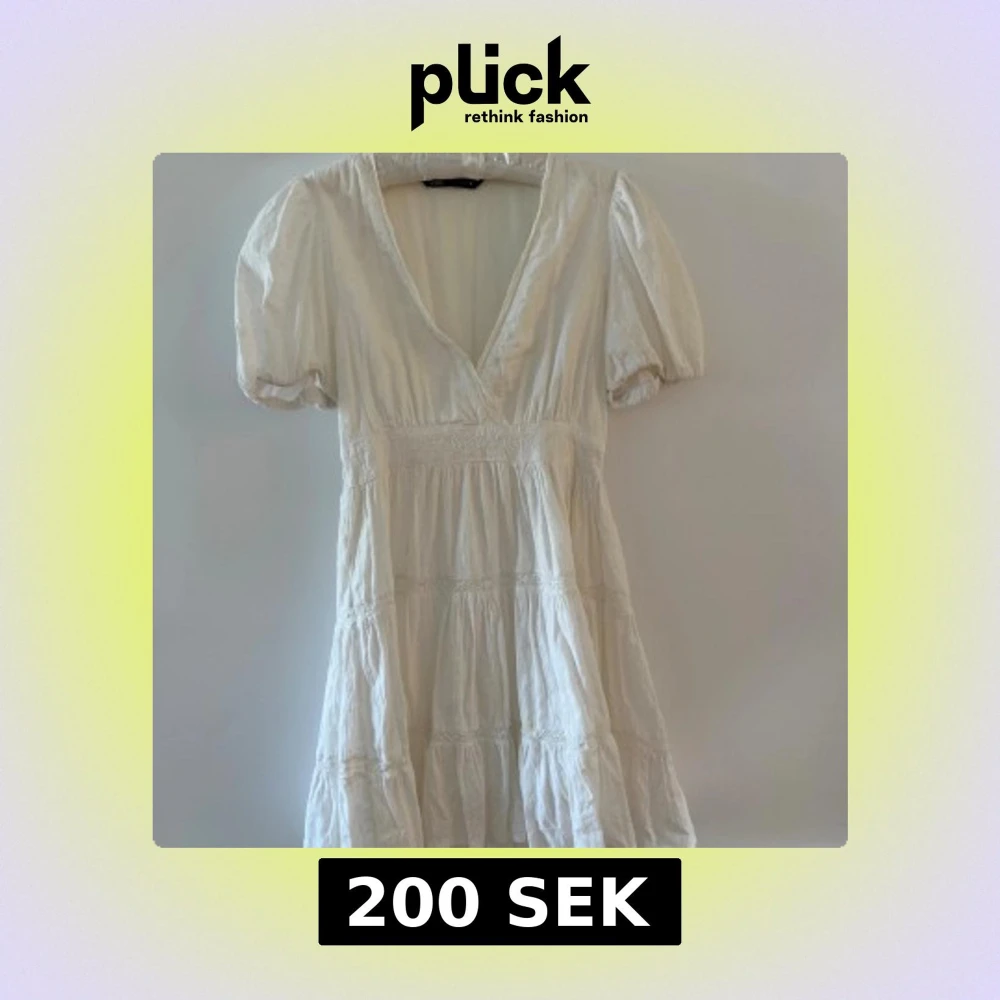 Superfin vit kortklänning från Zara med v-ringning och puffärmar. Klänningen har volangdetaljer och en luftig, flowy passform som ger en romantisk vibe. Perfekt för varma dagar och somriga tillfällen.