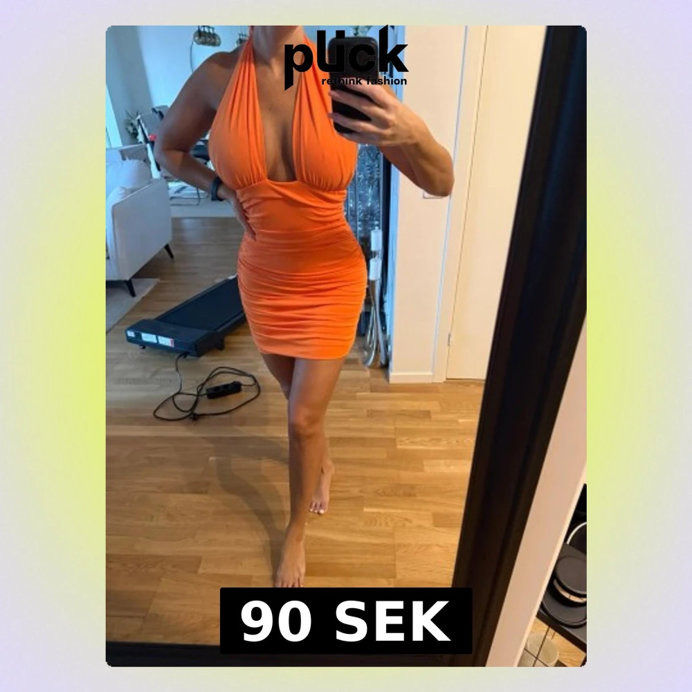 Säljer en snygg orange kortklänning med halterneck och djup urringning. Klänningen är figurnära och har en öppen rygg, vilket ger en riktigt trendig look. Perfekt för dig som vill sticka ut med färg och form.