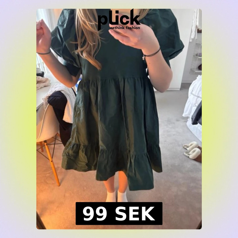 Supersöt mörkgrön klänning med volangkant och puffiga korta ärmar. Klänningen har en lös passform och är tillverkad i ett lätt material som ger en lyxig känsla. Perfekt för dig som gillar en trendig och bekväm stil.