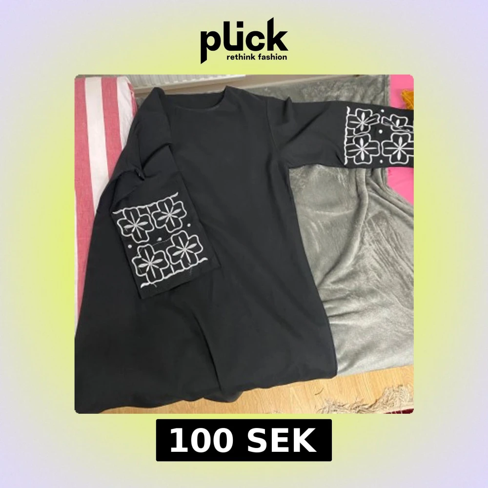 Elegant svart abaya med lång ärm och vitt blommigt mönster på ärmarna. Perfekt för en stilren look.