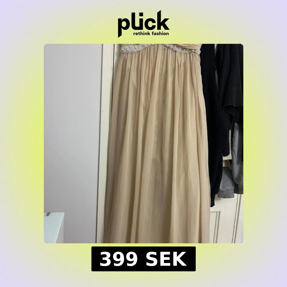 Elegant långklänning i champagnefärg med vackra pärldetaljer upptill. Klänningen har en romantisk och flowy siluett, perfekt för bal eller fest. Axelbandslös design som ger en stilren och lyxig känsla.