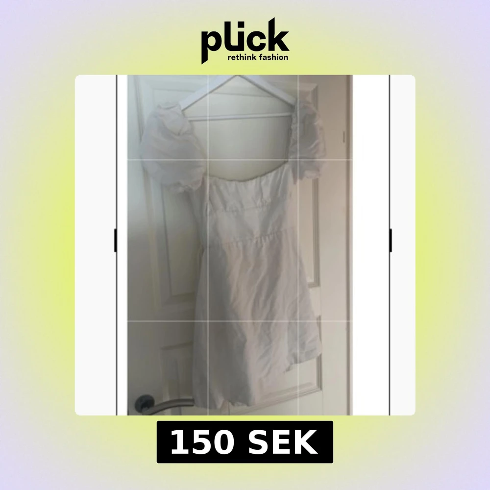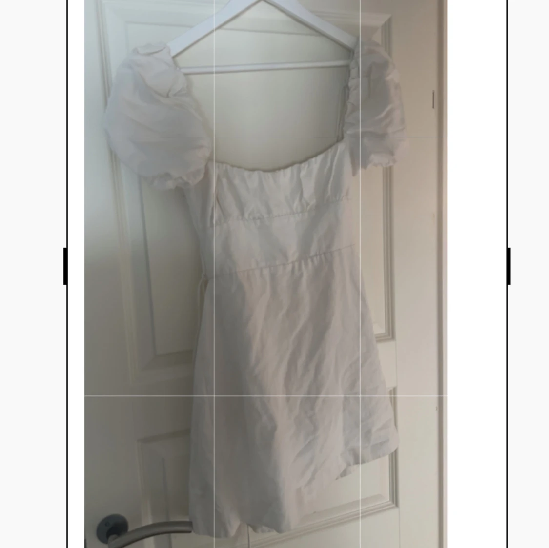 Supersöt vit kortklänning med puffiga ärmar och fyrkantig urringning. Storlek L men skulle säga den passar mer s-m🥰