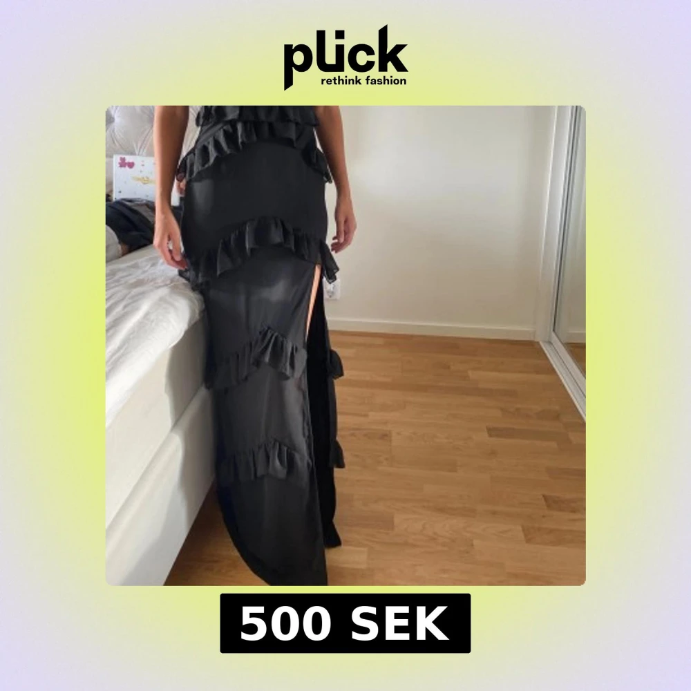 Säljer en svart axelbandslös långklänning från PrettyLittleThing, med flera lager volanger och en hög slits på ena sidan. Klänningen har en snygg twistad detalj vid bysten och sitter tight över kroppen. Perfekt till fest/bal och bröllop!!