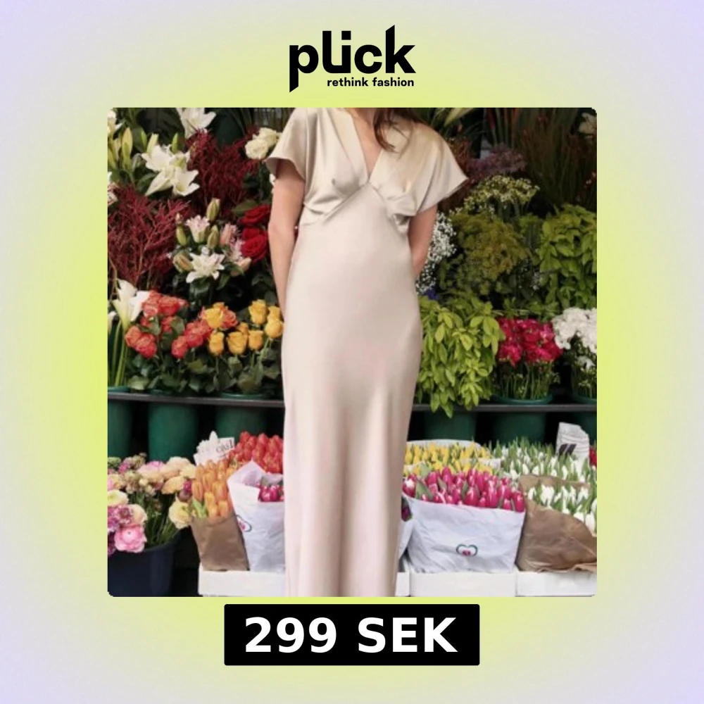Elegant långklänning i champagnefärgad satin med v-ringning och korta ärmar. Klänningen har en mjuk, glansig yta och ett stilrent, flytande fall som ger en lyxig känsla. Perfekt för dig som vill sticka ut med en sofistikerad look.