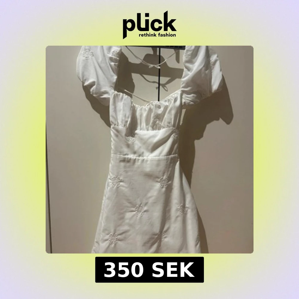 Säljer en söt vit klänning med broderade blommor och öppen rygg. Klänningen har korta puffärmar och en smickrande passform. Perfekt för sommarens alla festligheter och studenten! 🌸