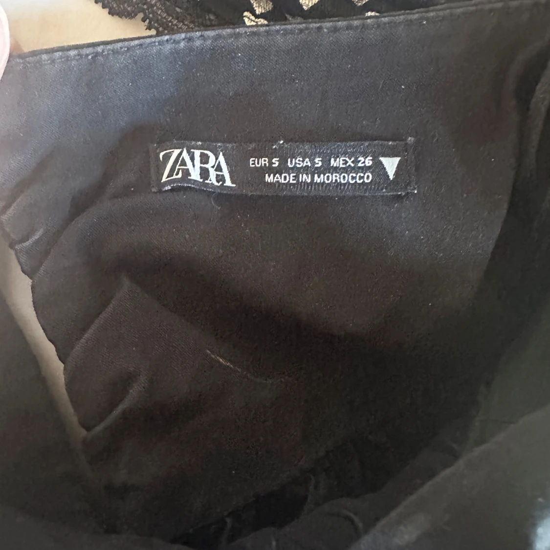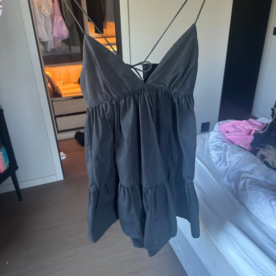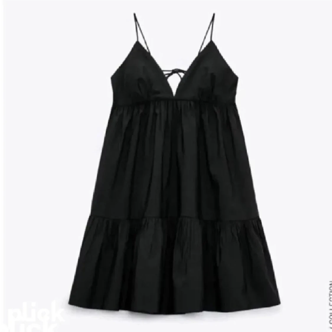 Säljer en svart kortklänning från Zara med tunna axelband och v-ringning. Klänningen har en luftig passform och volangdetalj nedtill. Perfekt för varma dagar eller när du vill känna dig extra bekväm.