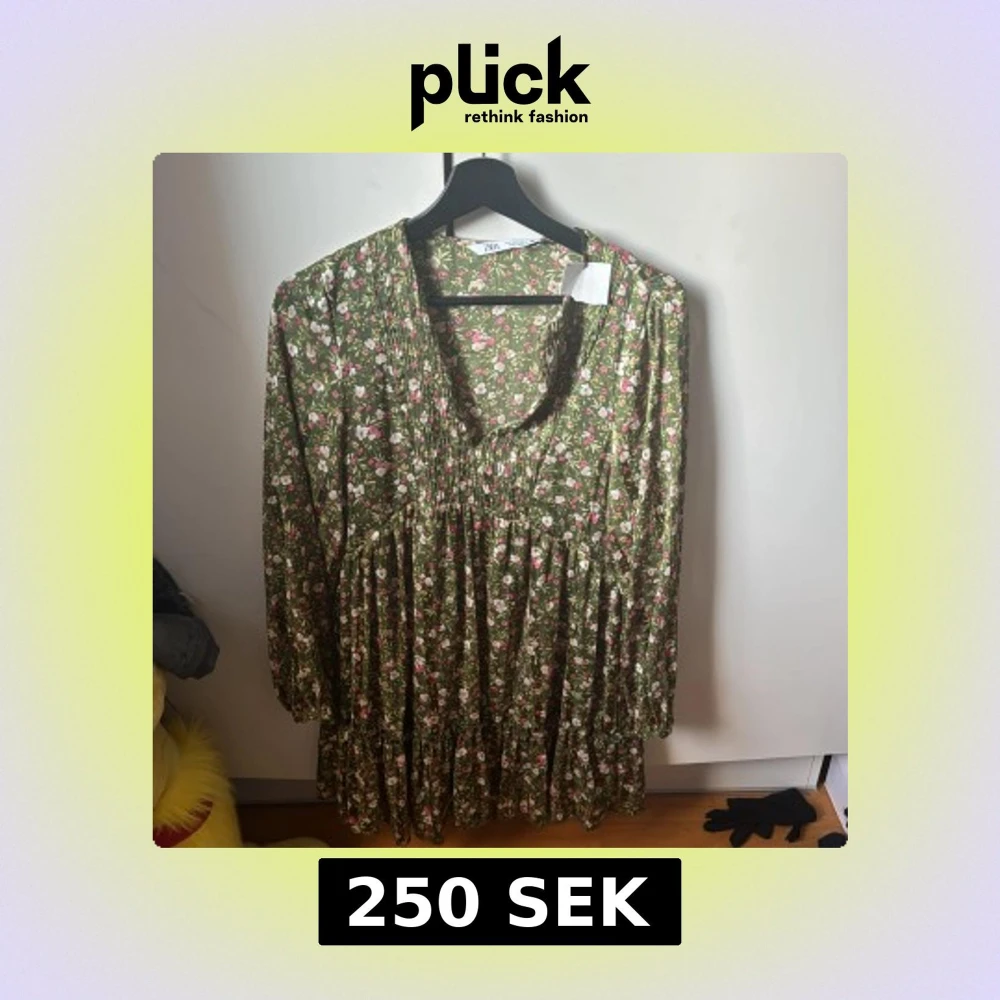 Charmig grön klänning från Zara med ett blommigt mönster i rosa och vitt. Klänningen har en v-ringad design och långa ärmar, perfekt för en avslappnad stil. Tillverkad i ett lätt och bekvämt material. Prislappen är kvar!